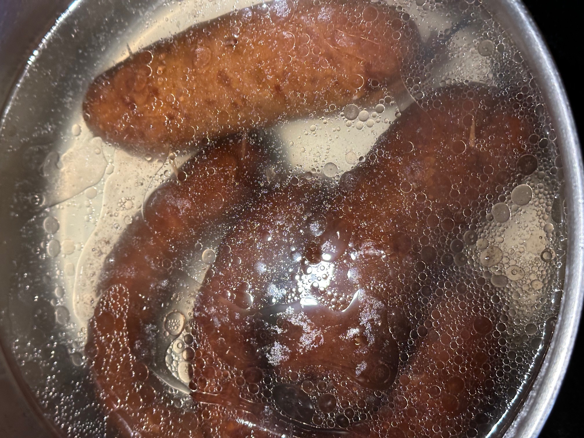 - Metterle in una pentola con acqua fredda, portare a ebollizione e cuocere per almeno tra 50 e 70 minuti appena sotto il punto di ebollizione (dipende dalle salsicce! ad es. la saucisse au choux necessita solo di 30 minuti se no si sfalda).