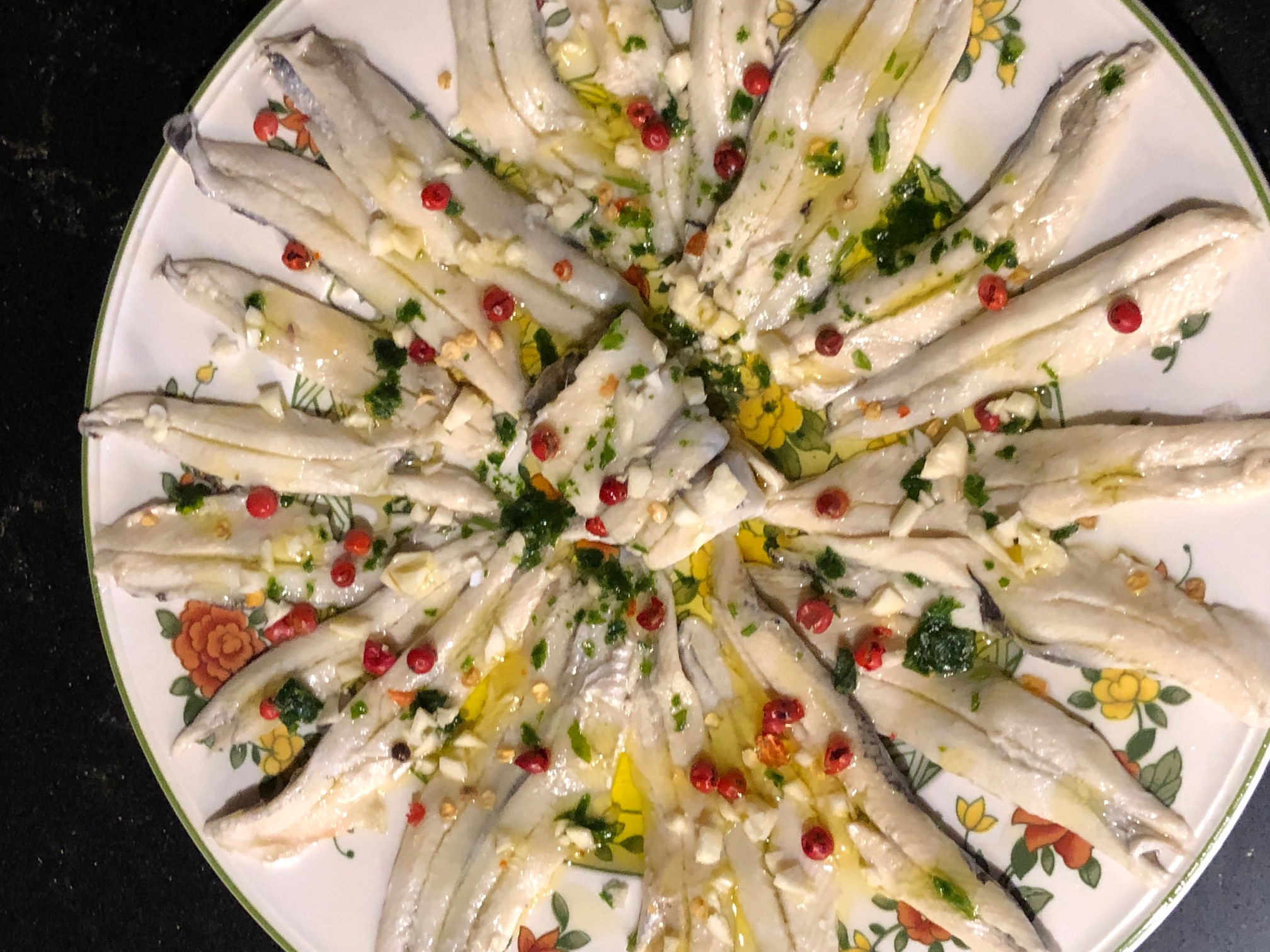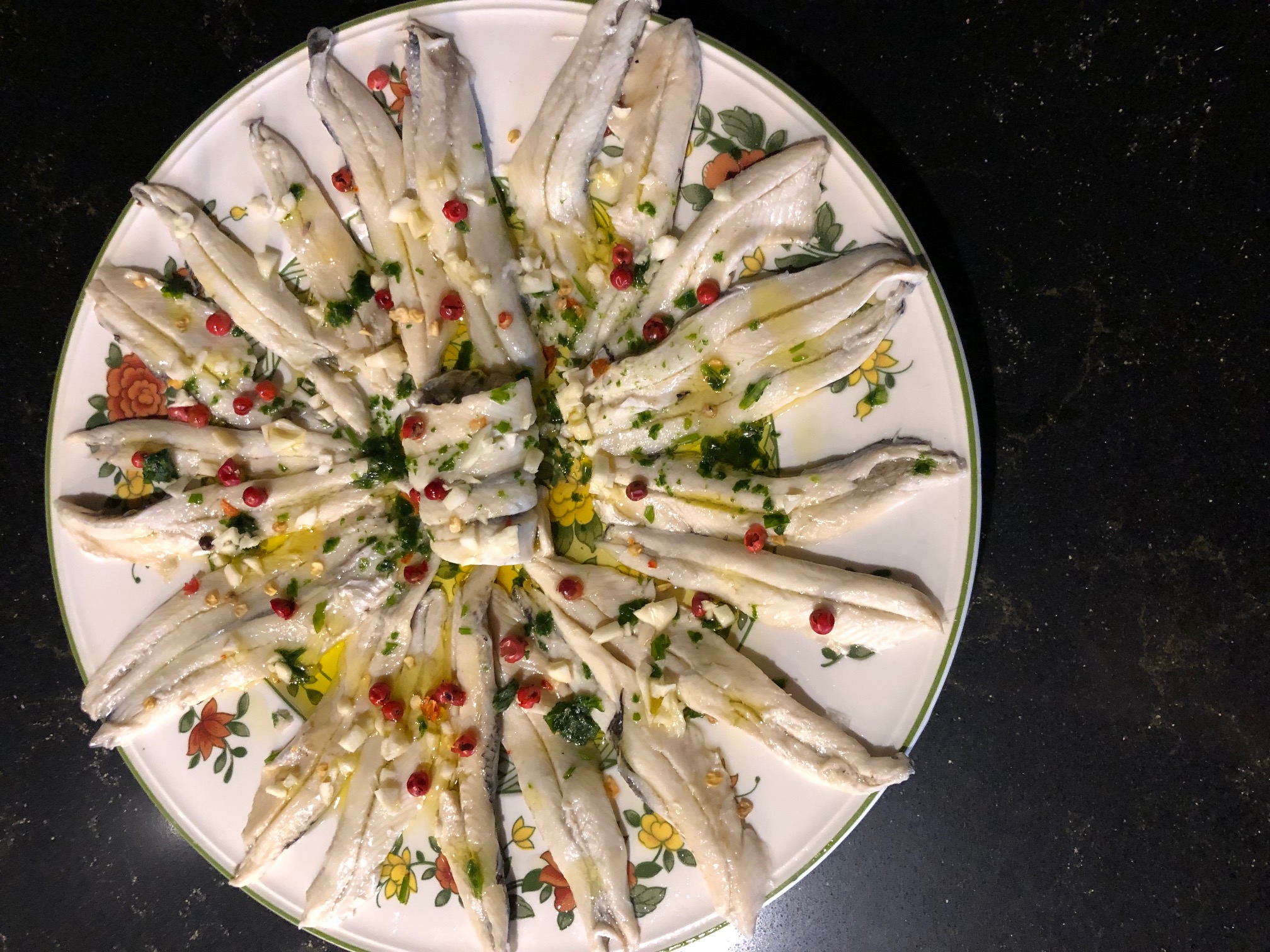- Disporre i filettini a raggiera su di un piatto rotondo, la pelle verso il basso.
