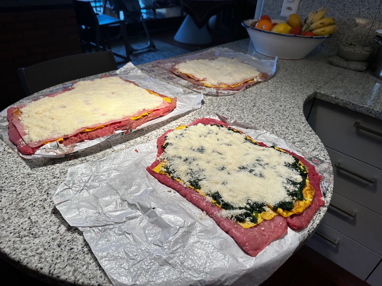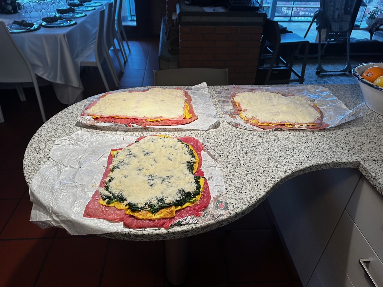 - Ricoprire la fetta di carne dapprima con le frittate, poi con il prosciutto ed infine col parmigiano.