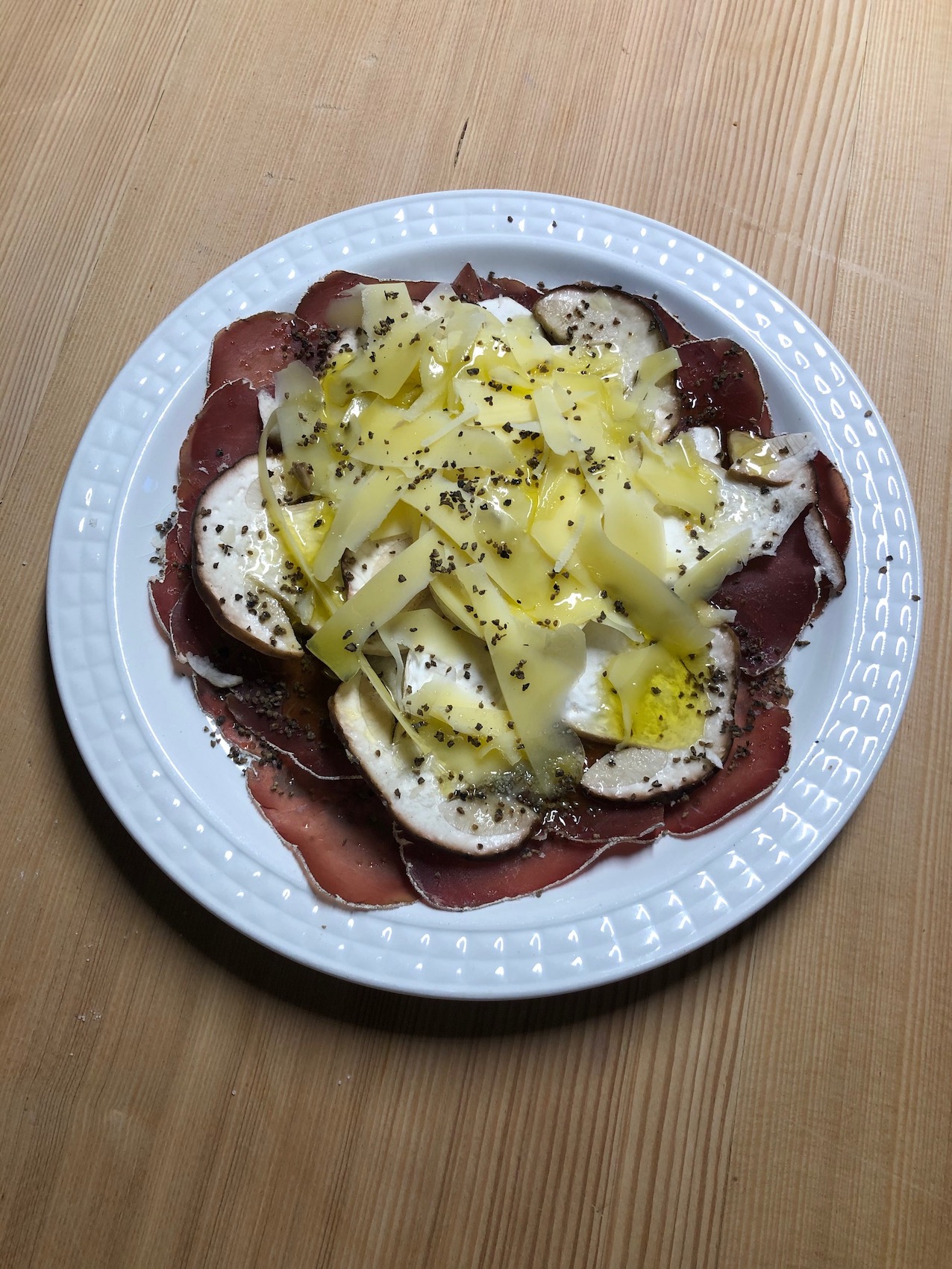 - Affettarvi sopra il porcino fresco utilizzando una mandolina con lama molto fine (in alternativa usare un pelapatate).