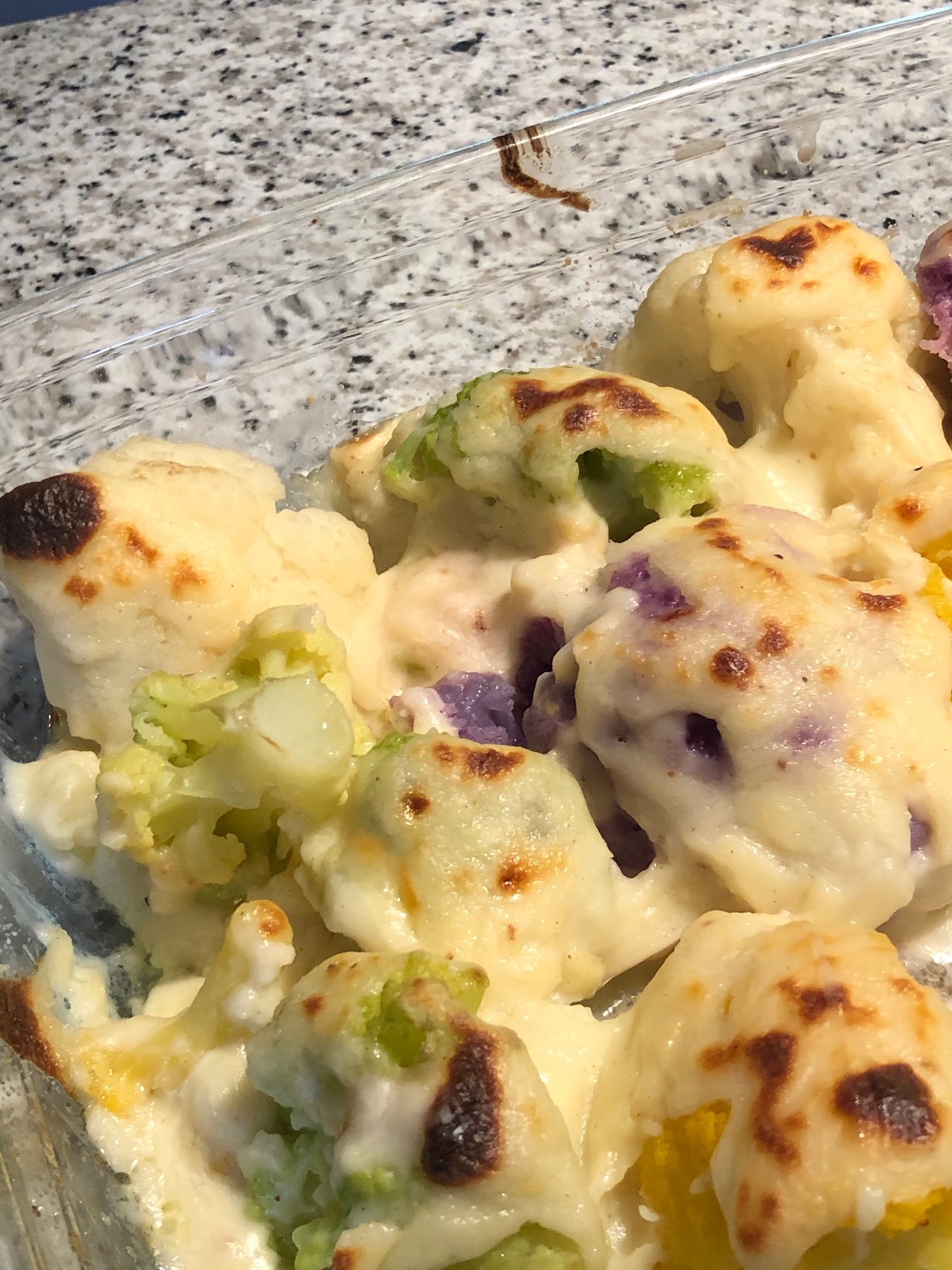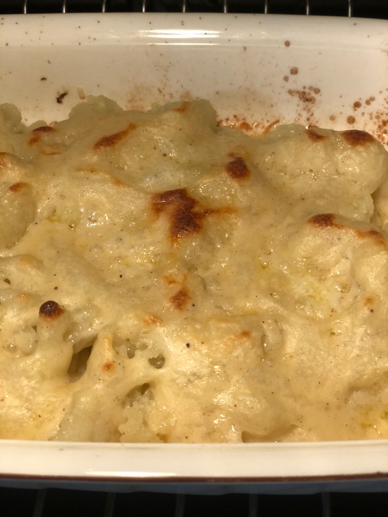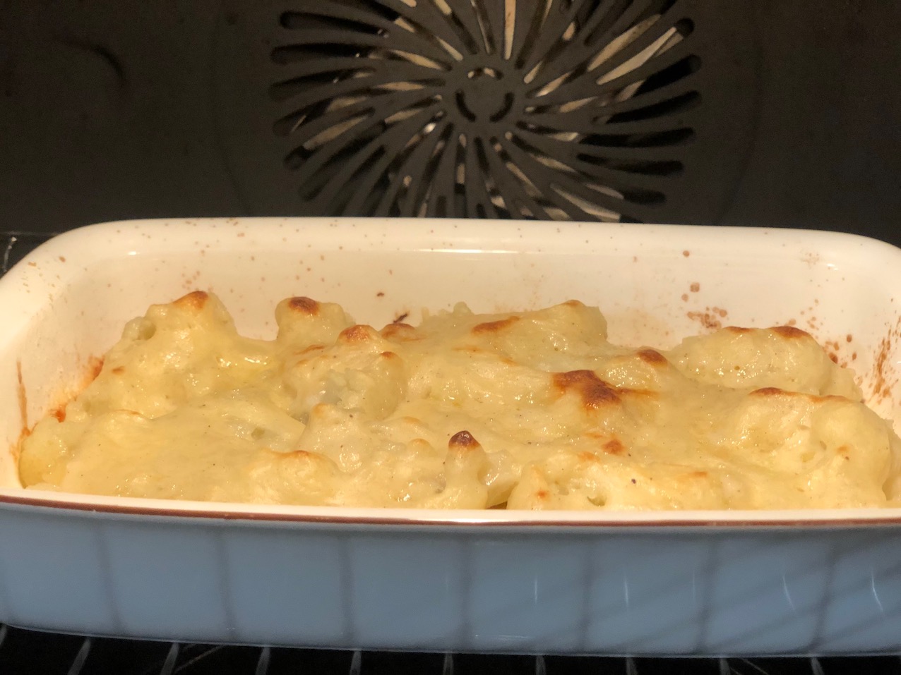 - Spostare i cavolfiori sgocciolati in una teglia da forno, versarvi sopra il formaggio grattugiato, poi la béchamel ed alcuni fiocchetti di burro.