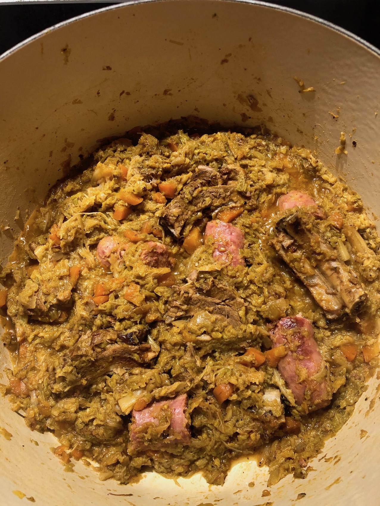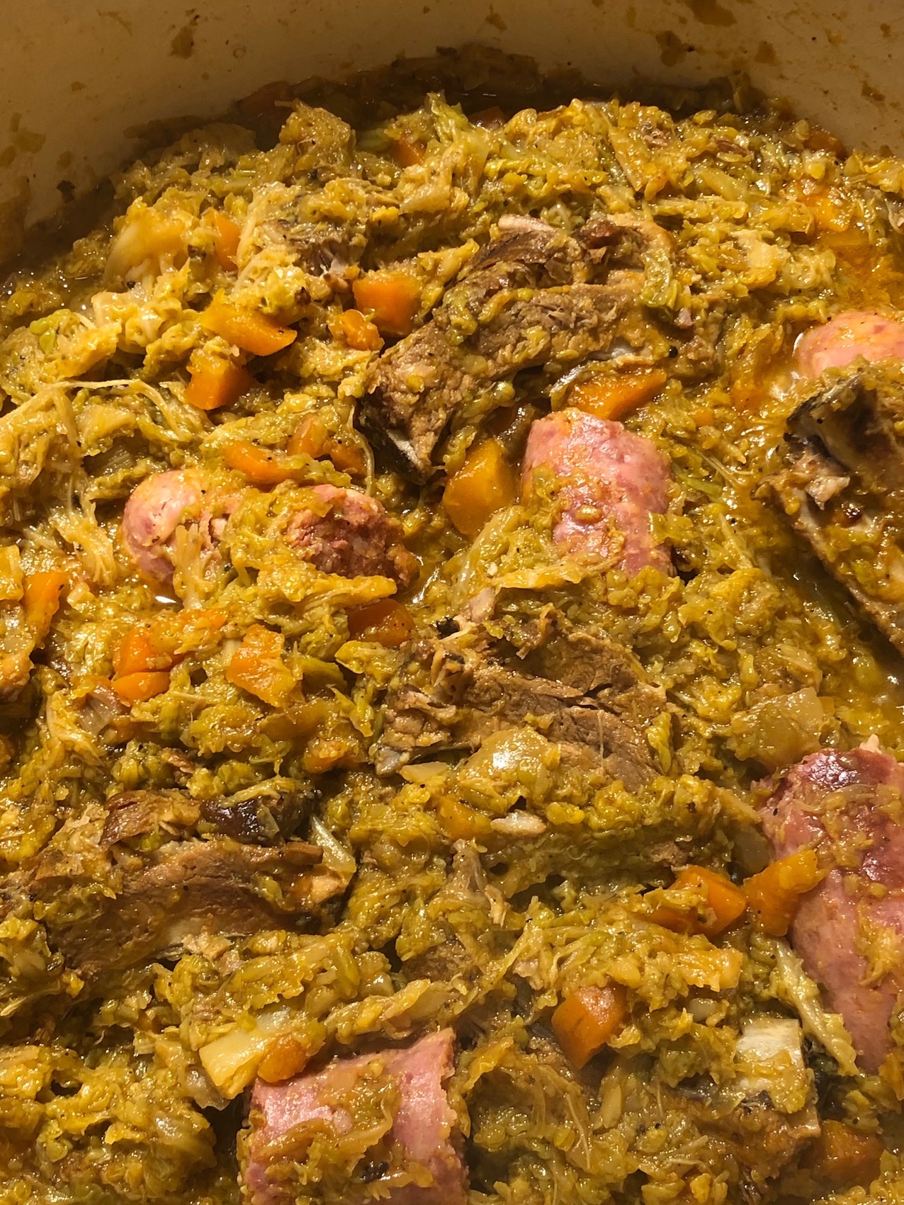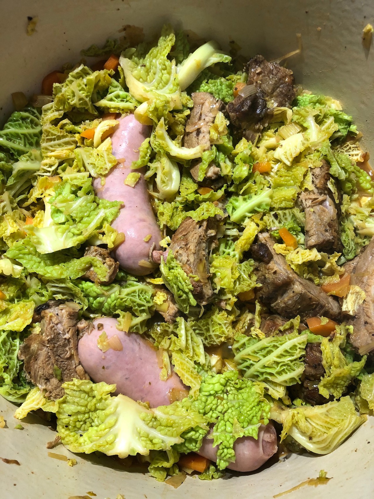 - Trascorse le 2 ore di cottura, aggiungere alla carne la verza e le luganighe.