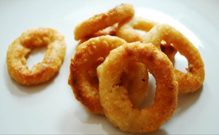(ev prima di tuffarle nella pastella passare ancora le rondelle di cipolla nella farina).