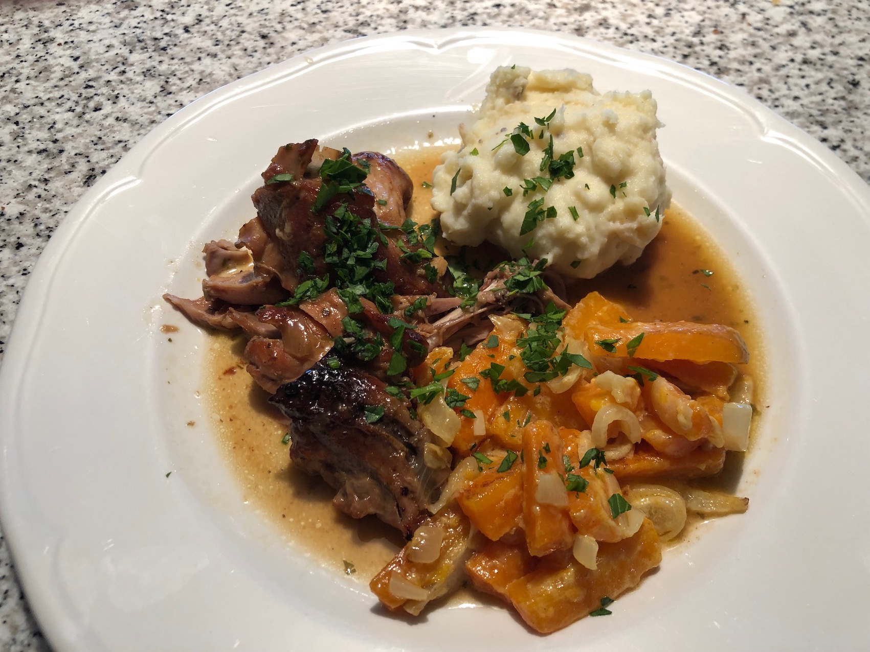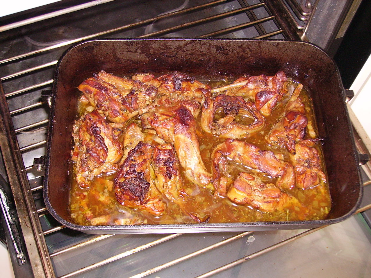 - Controllare che ci sia sempre del fondo di cottura e ogni tanto bagnare il coniglio e girare i vari pezzi.