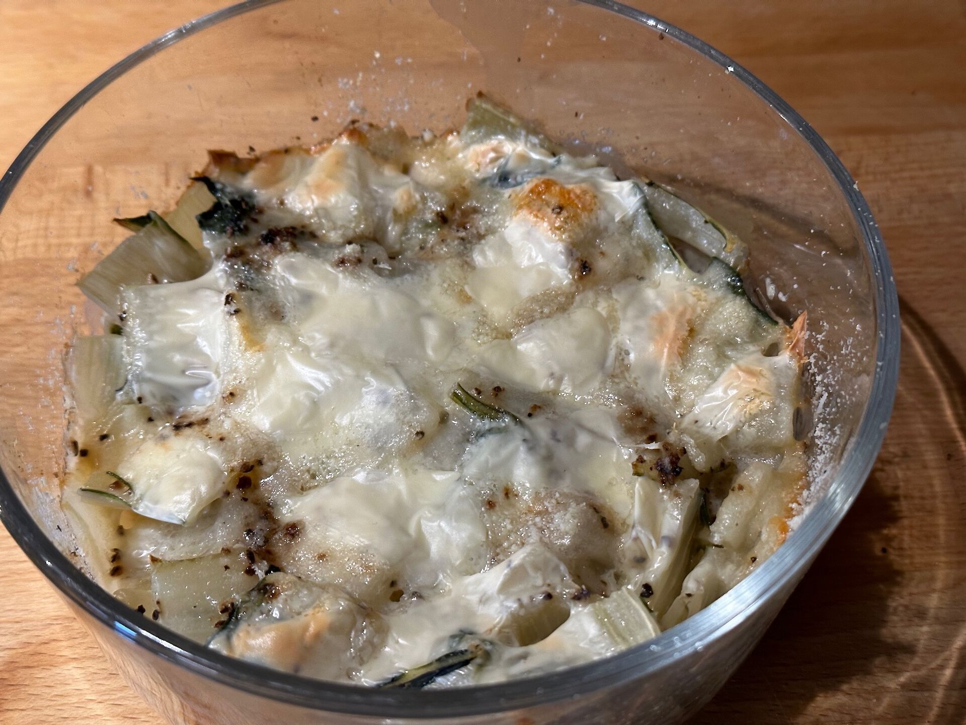 - in variante si può tralasciare la béchamel e gratinare solo con formaggio e burro. Al limite potrebbe anche essere tralasciato il formaggio.