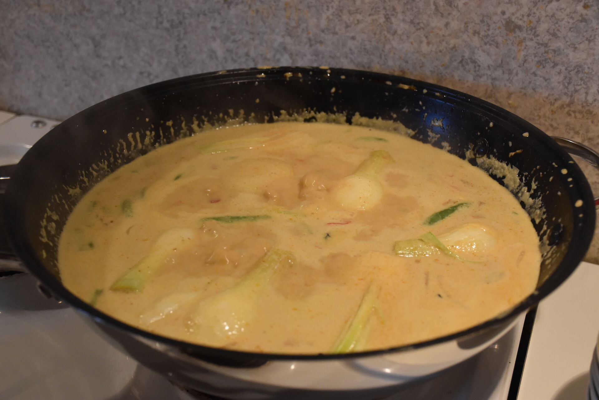 - In una padella o wok scaldare il latte di cocco con il contenuto della confezione.