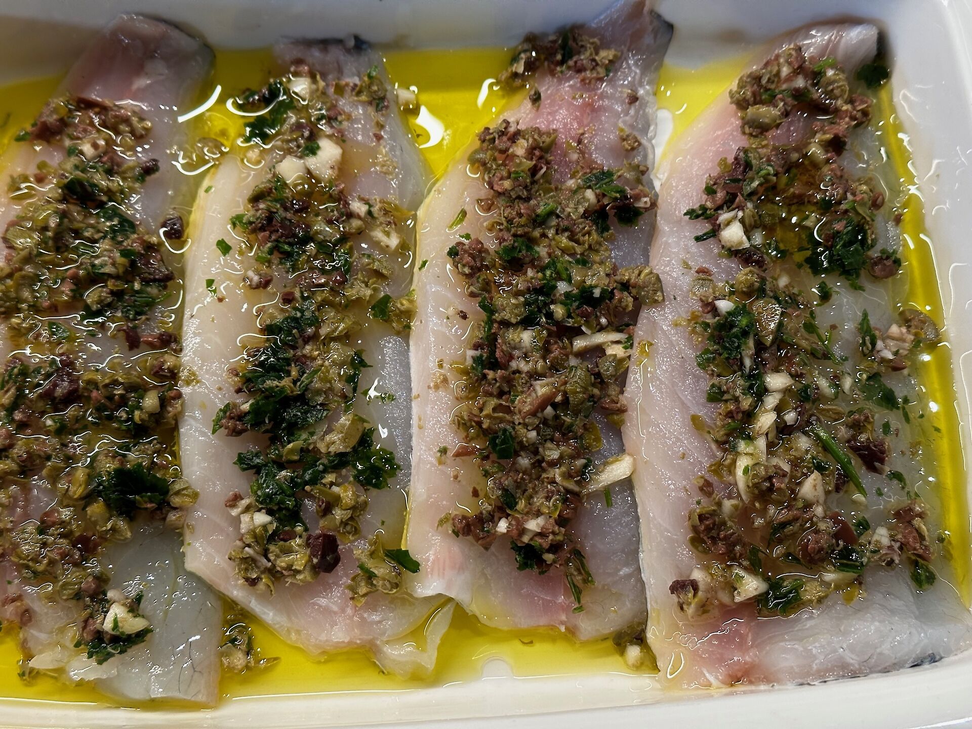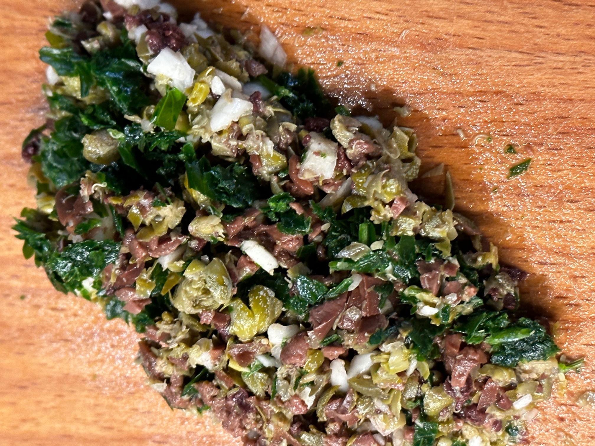 - Preparare un trito con capperi, olive snocciolate, prezzemolo, aglio e olio.