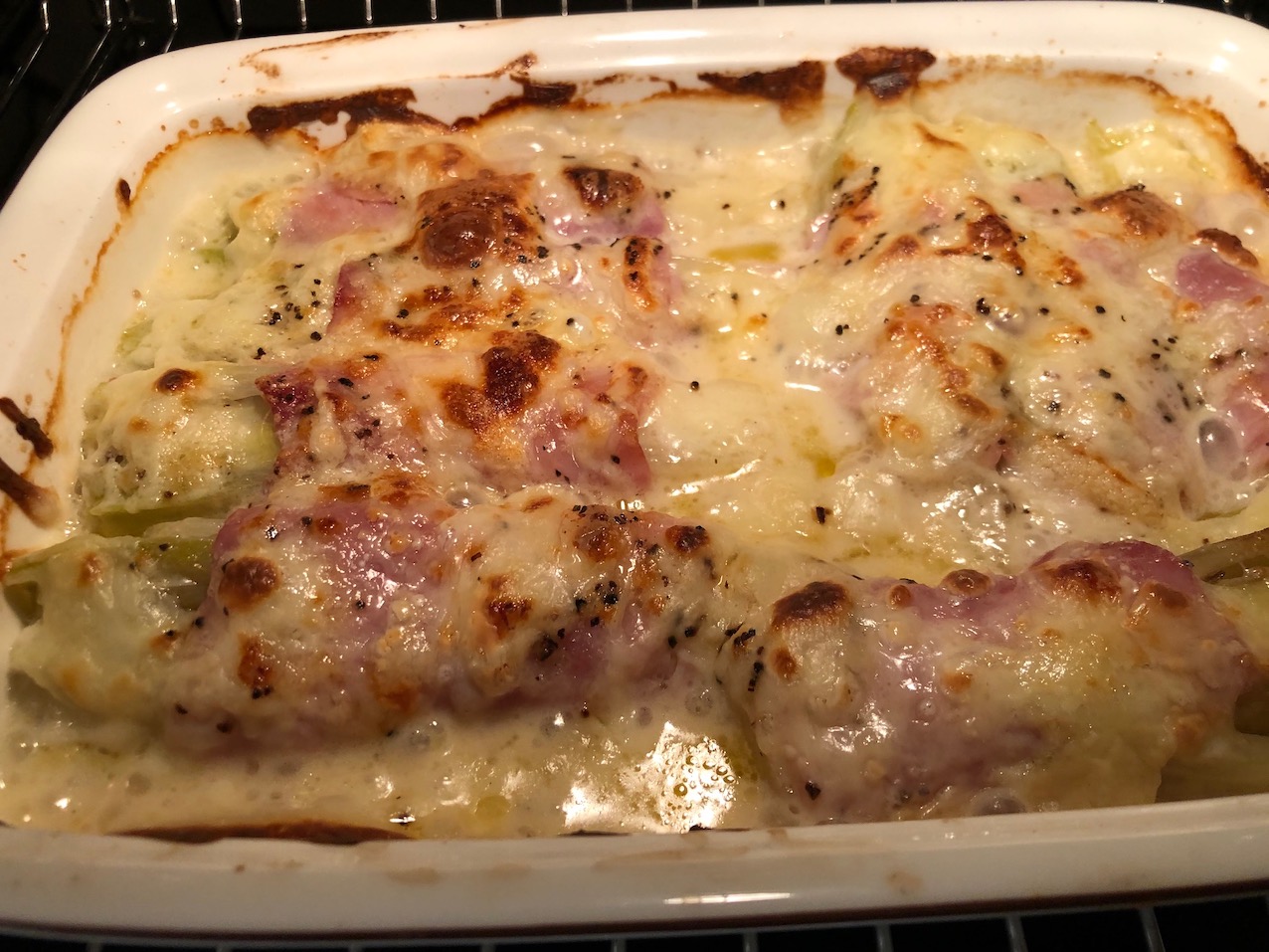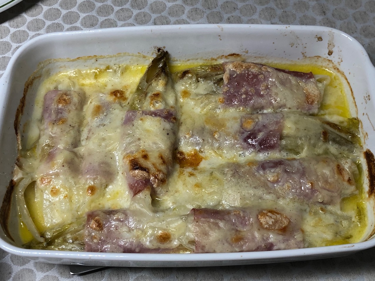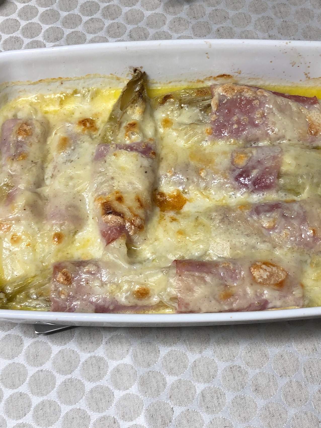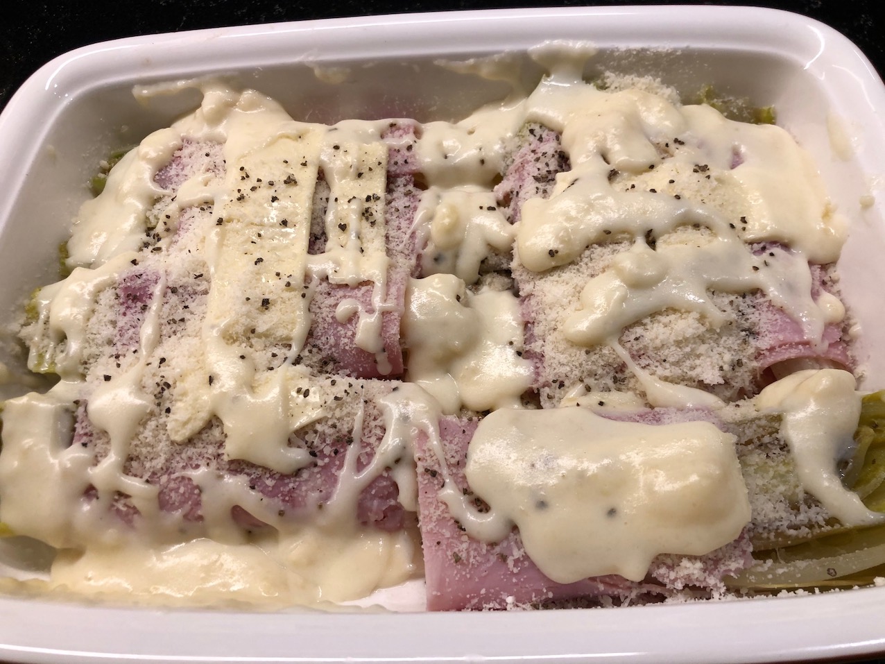 - Avvolgere ogni porzione di indivia in una fetta di prosciutto cotto e adagiarle in una pirofila.