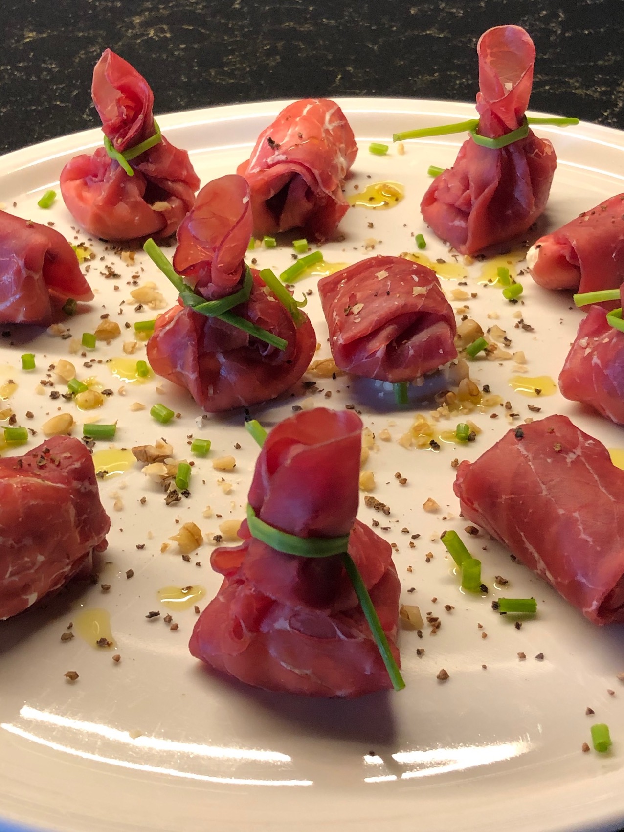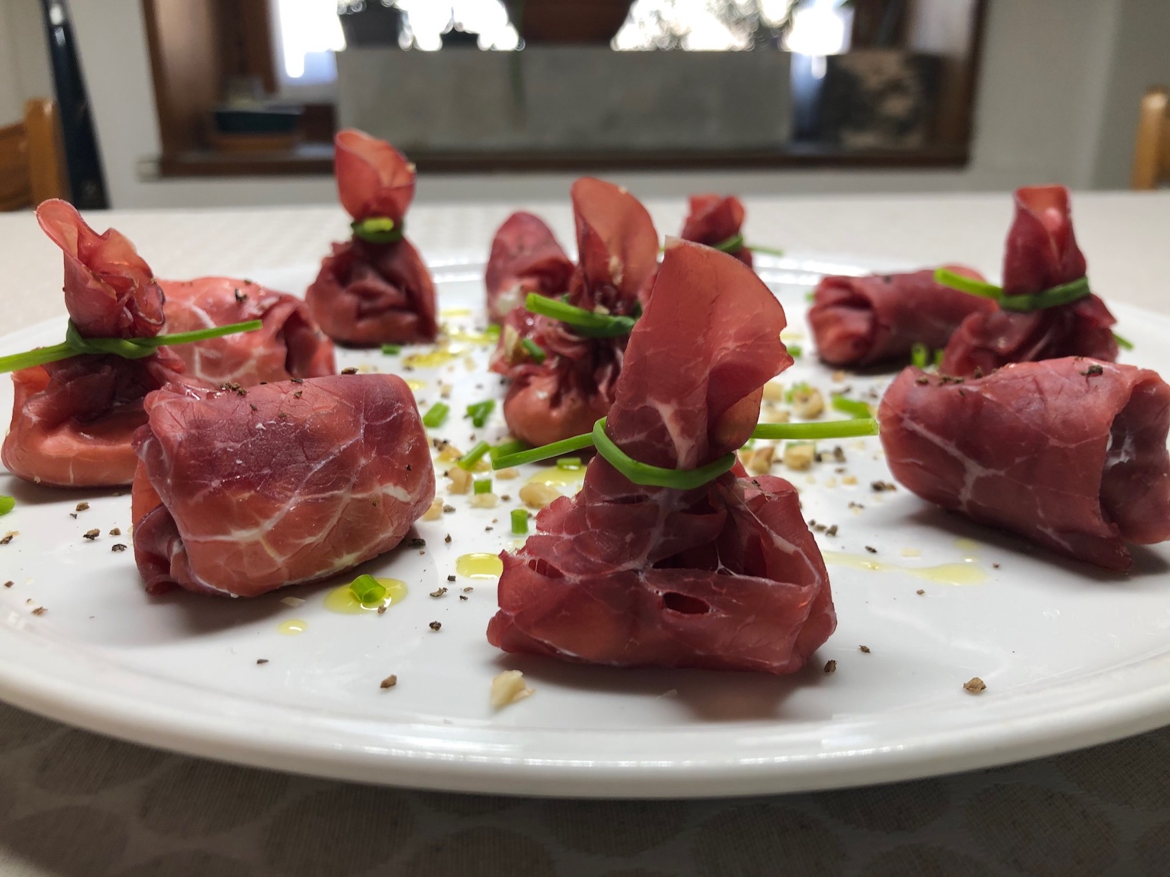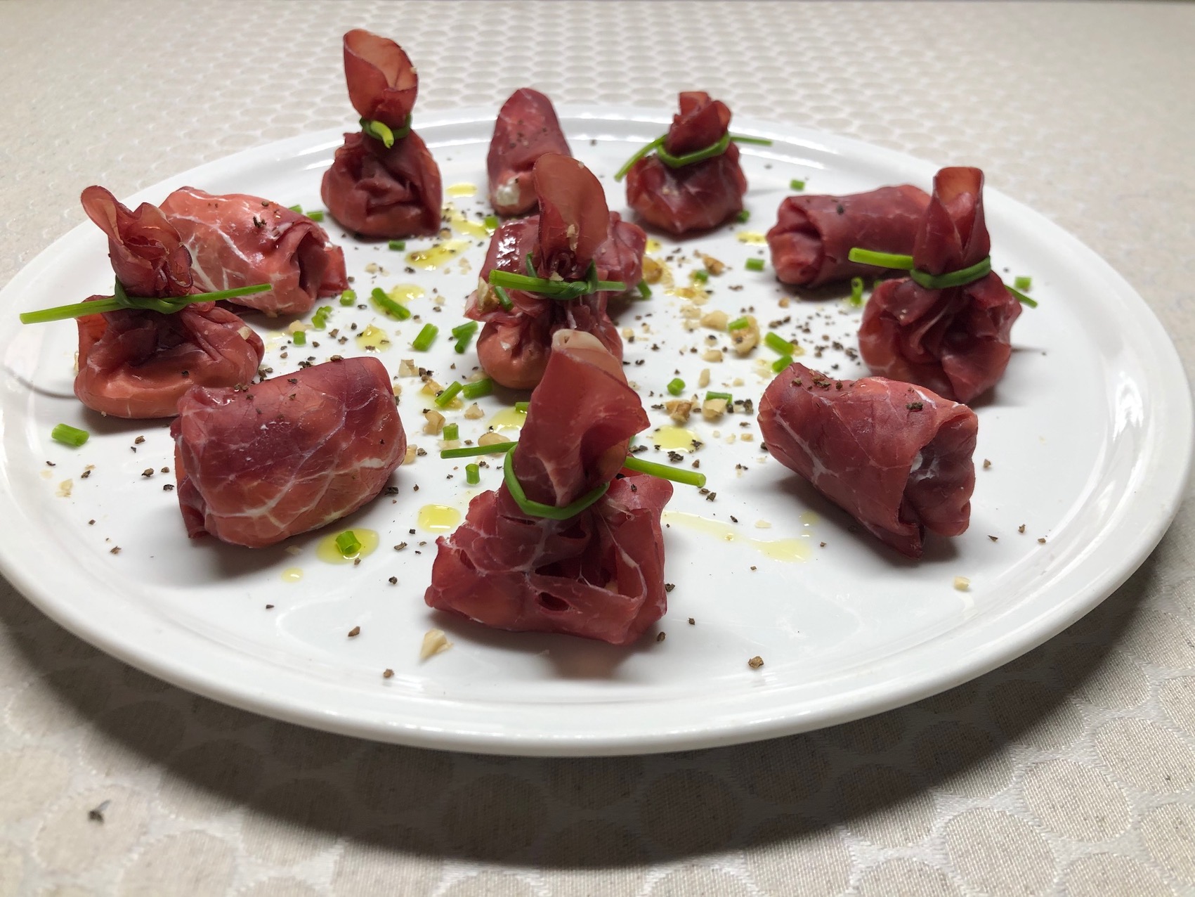 - Spalmare le fette di bresaola con il composto e arrotolarle in modo da formare degli involtini.