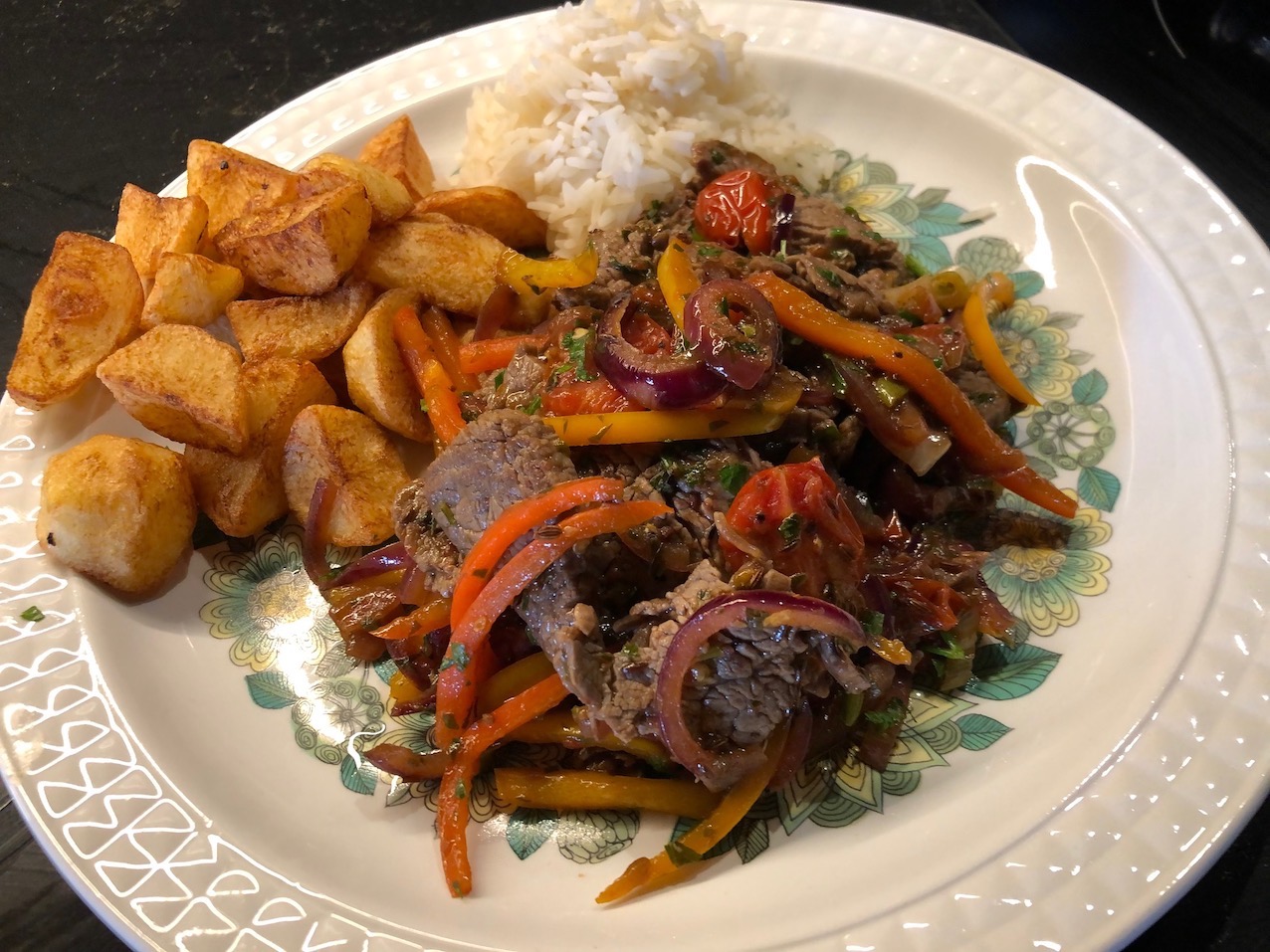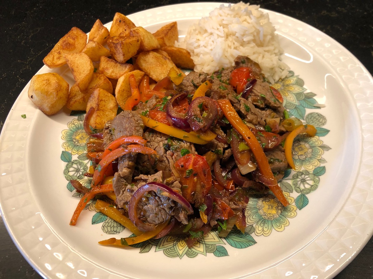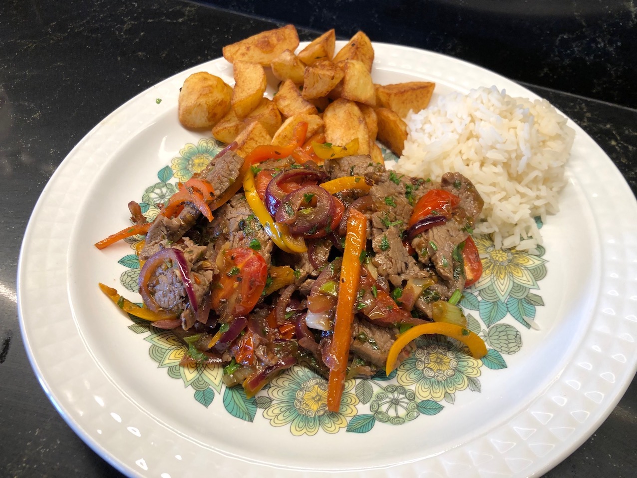 - Il lomo saltado è servito tradizionalmente assieme a riso bianco bollito e a patate fritte.