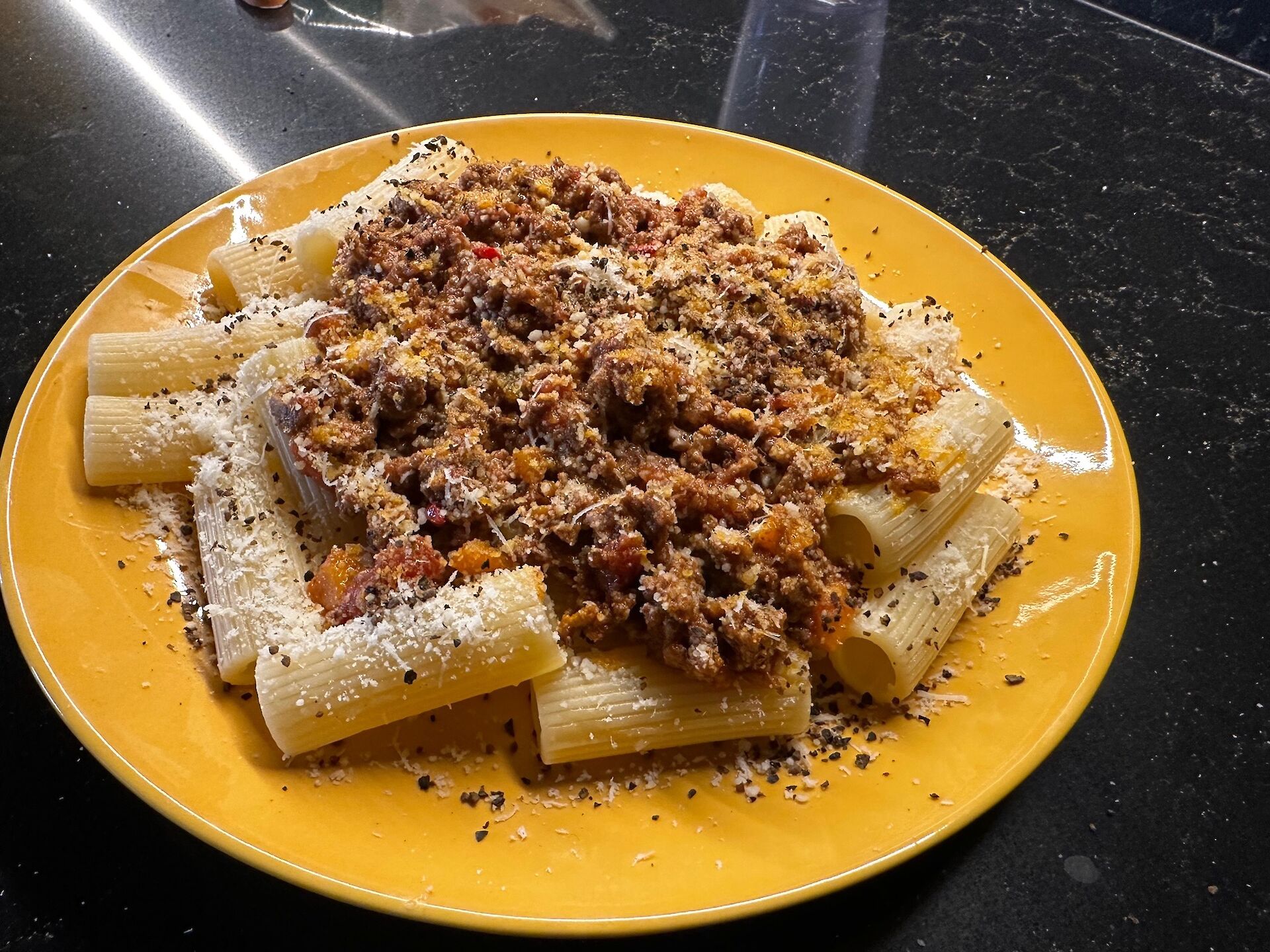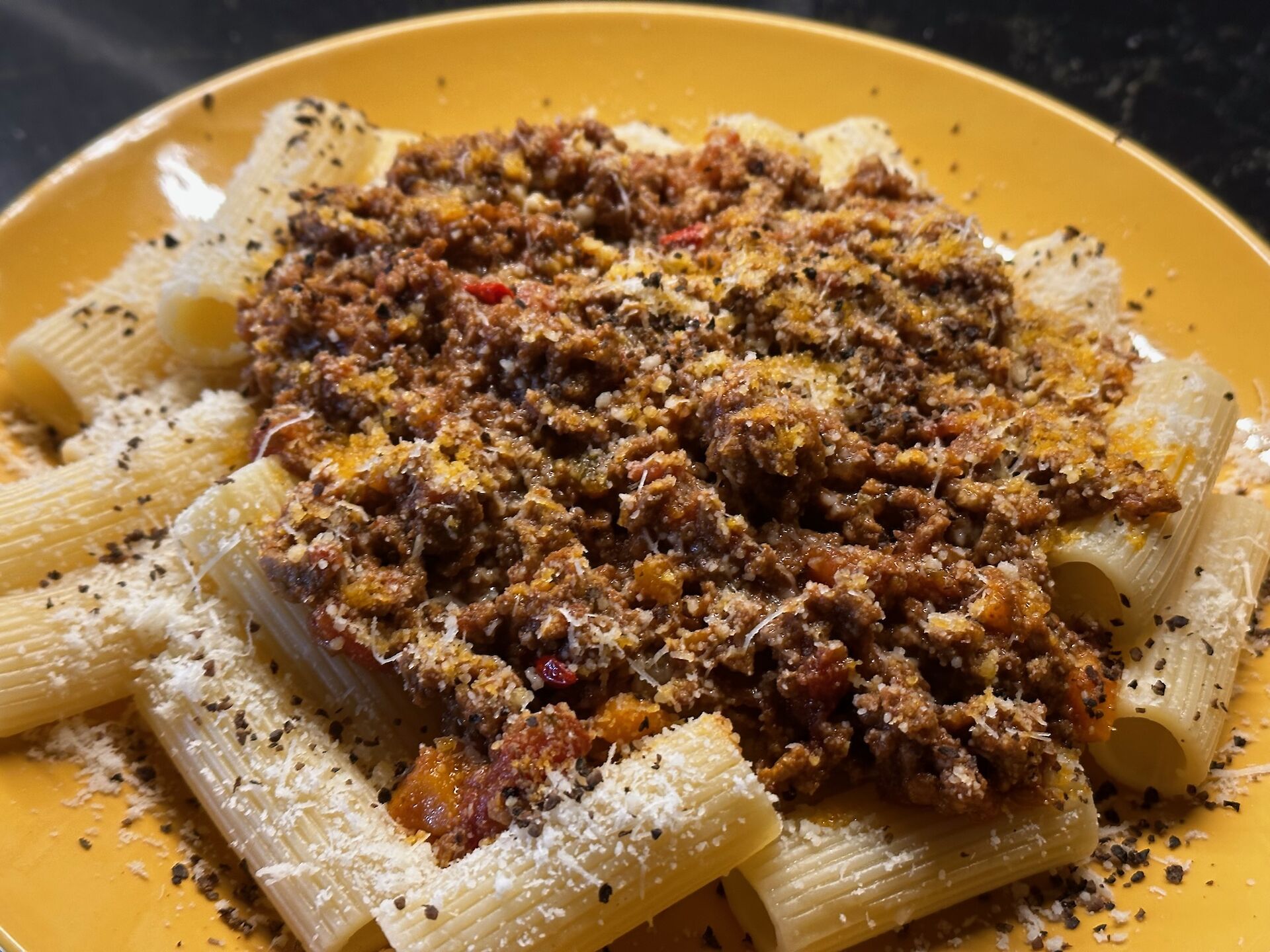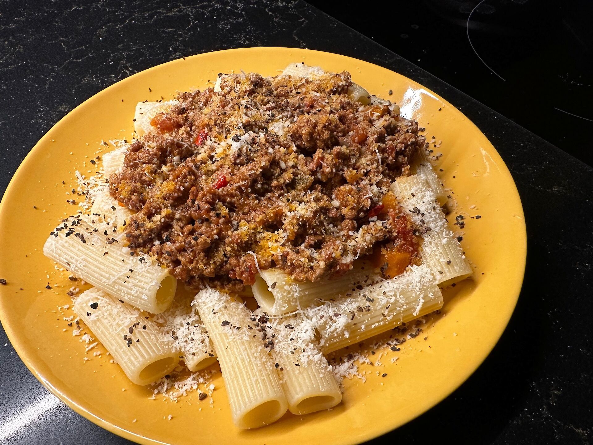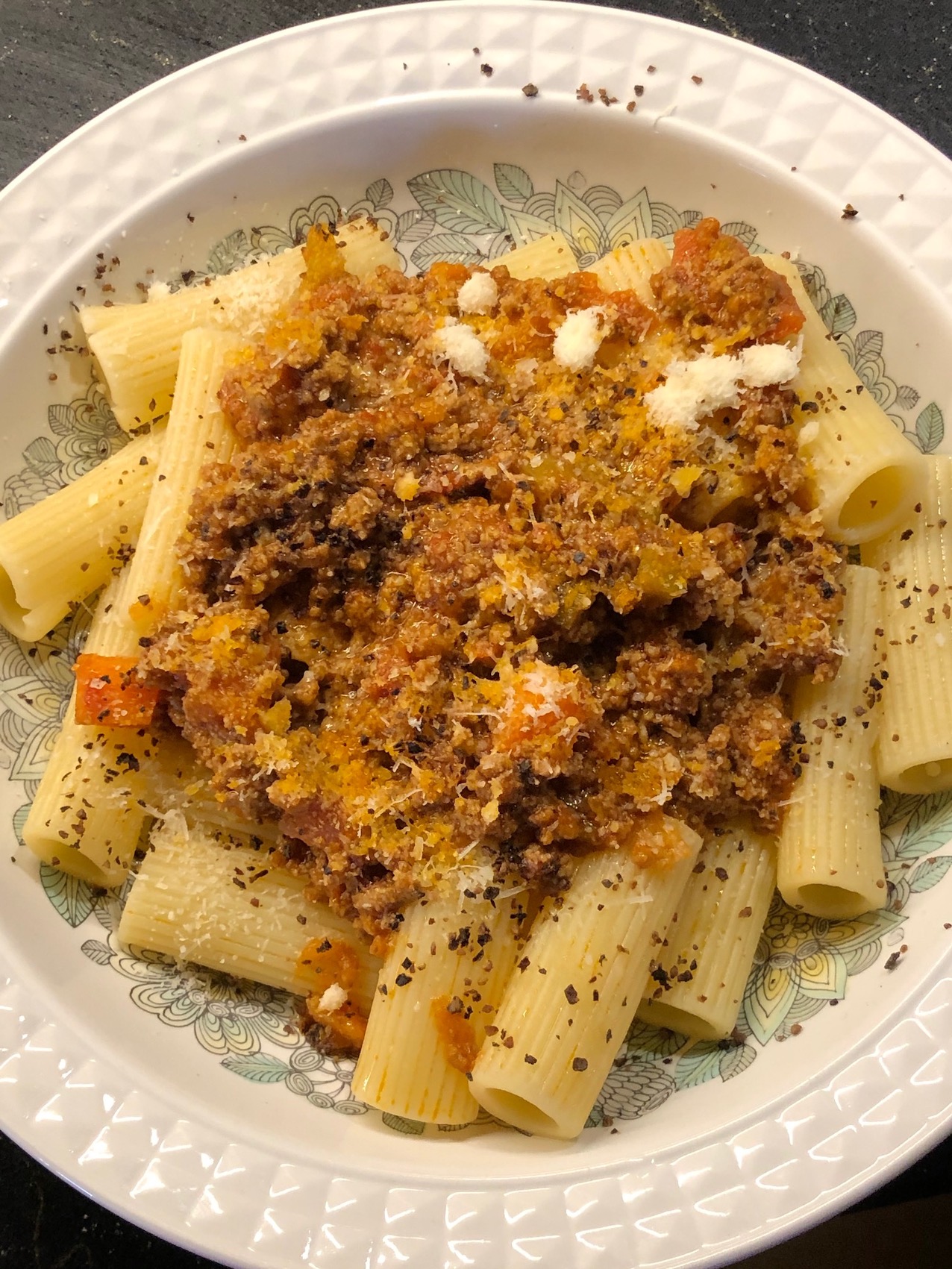 per il ragù, vedi ricetta oppure, fare una versione più semplice (a livello di tempi di cottura...) con - 200 gr di carne di manzo tritata