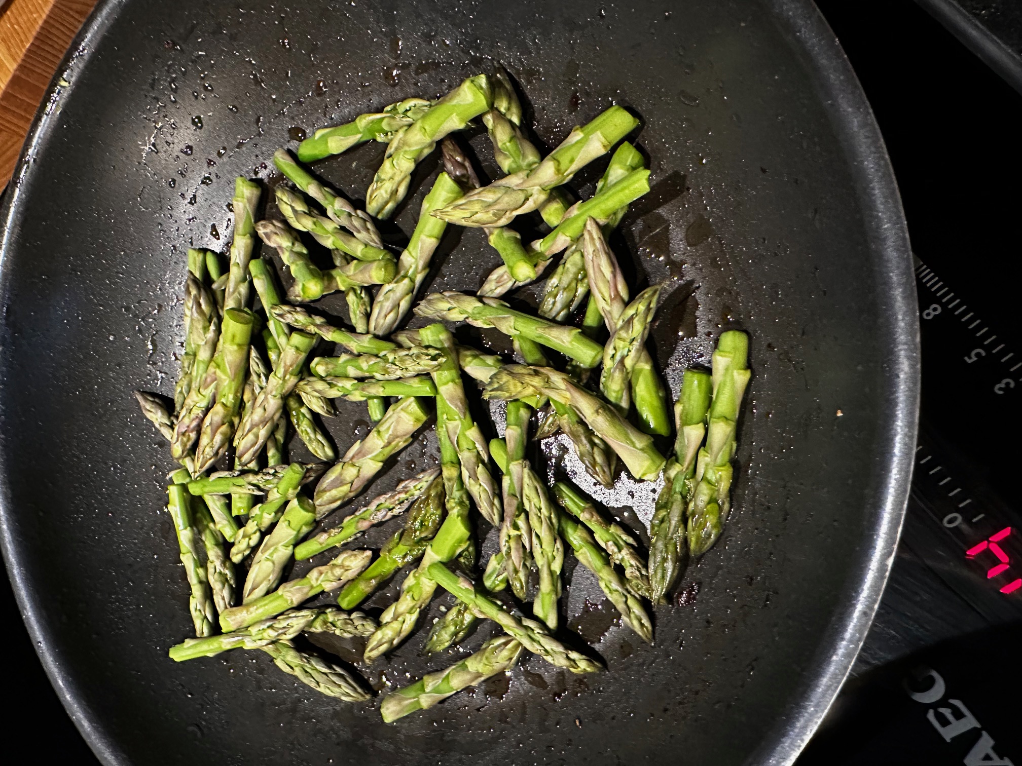 - Nella stessa pentola eventualmente con l'aggiunta di un po' di burro, rosolare per una decina di minuti le punte di asparagi.