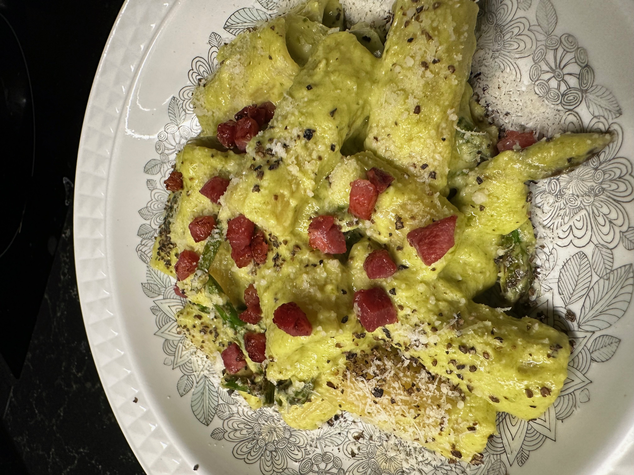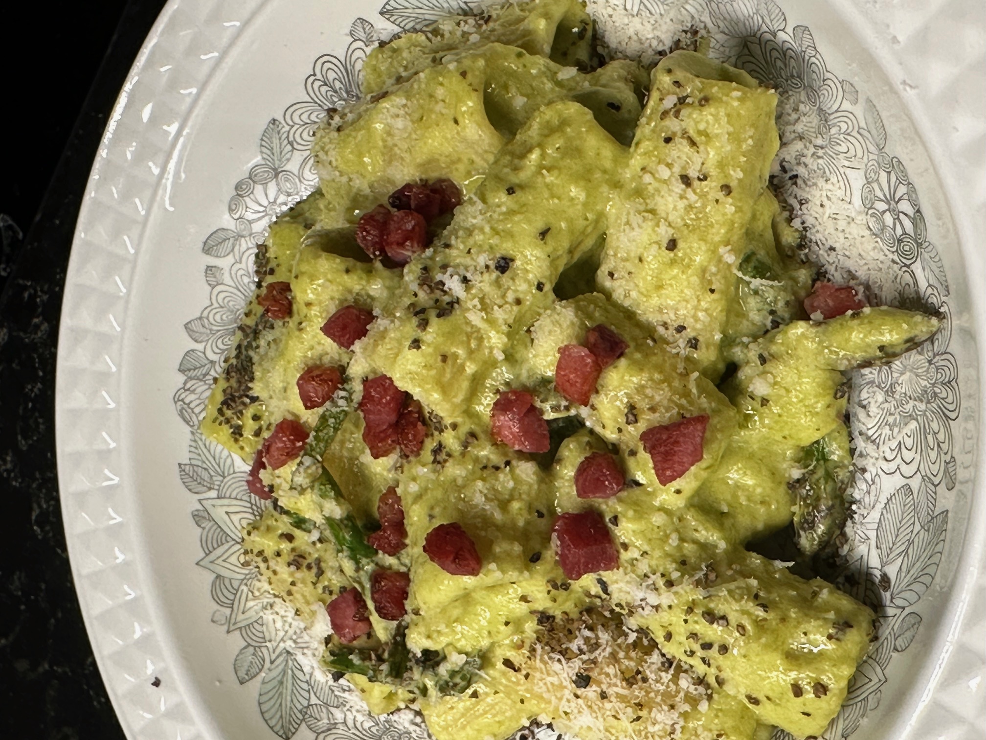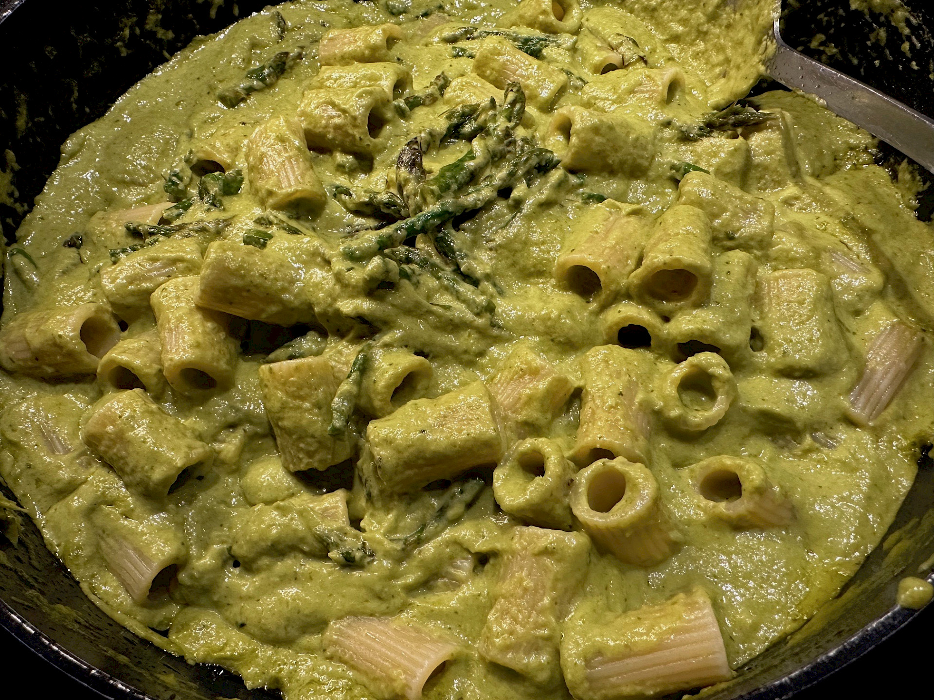 - Nella stessa pentola mischiare pasta e crema di asparagi.