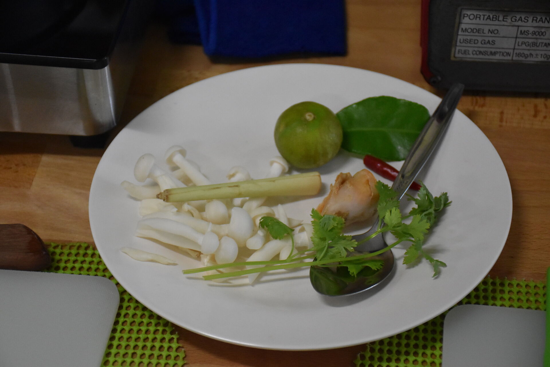 - Aggiungervi lemongrass, kaffir, galangal, peperoncino, due spruzzi di salsa di pesce e funghi.