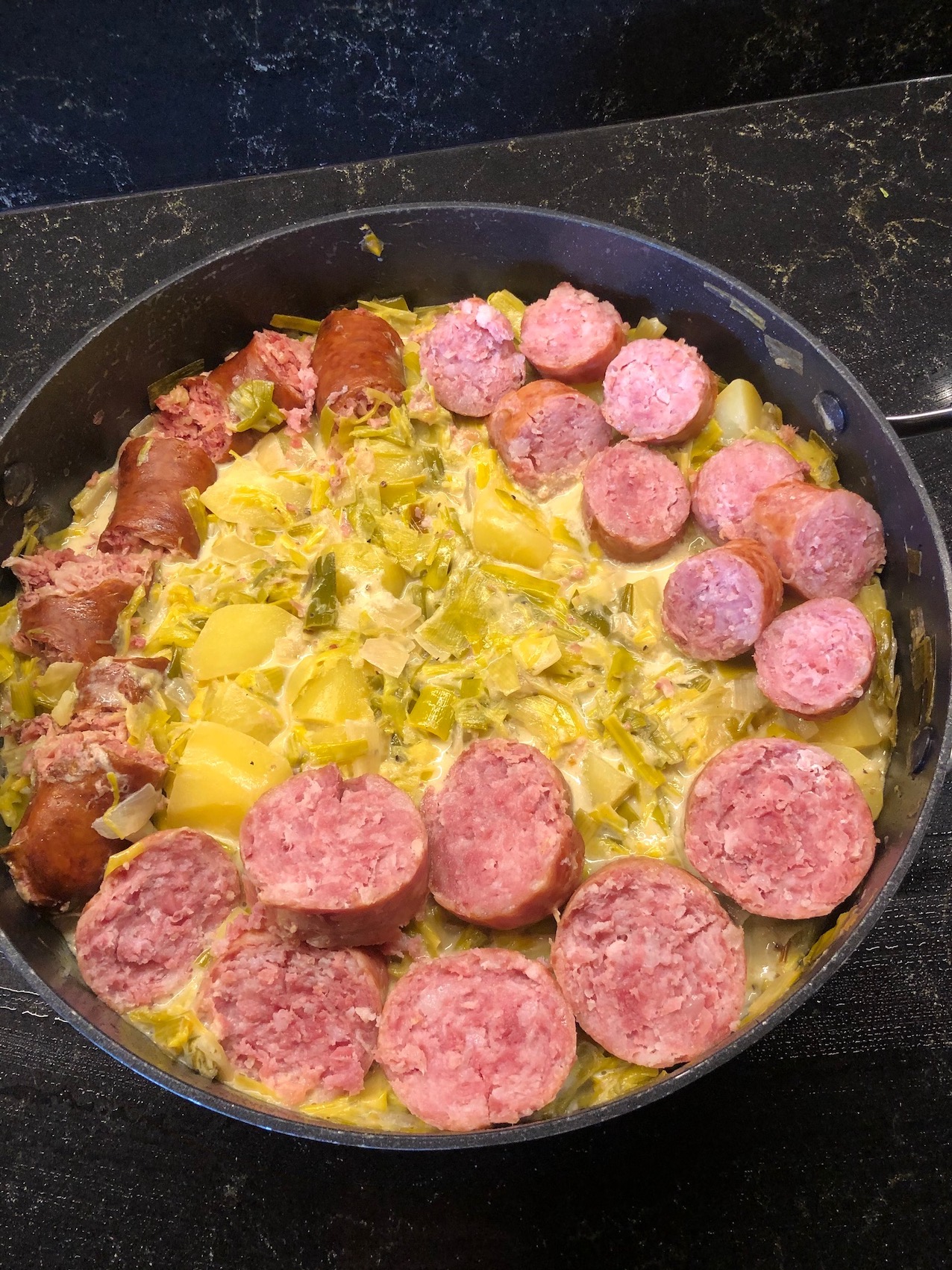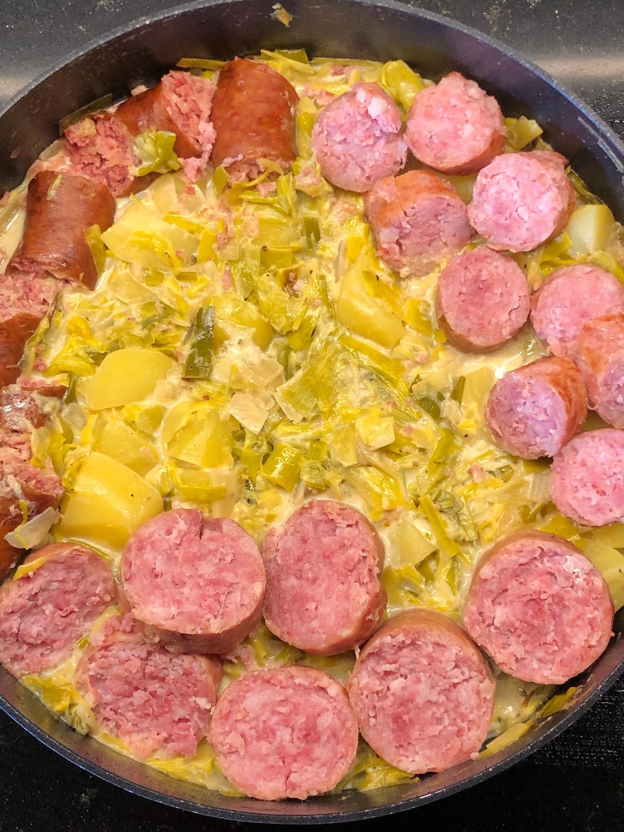 - Tagliare le salsicce a rondelle e servirle adagiate sul letto di porri e patate.