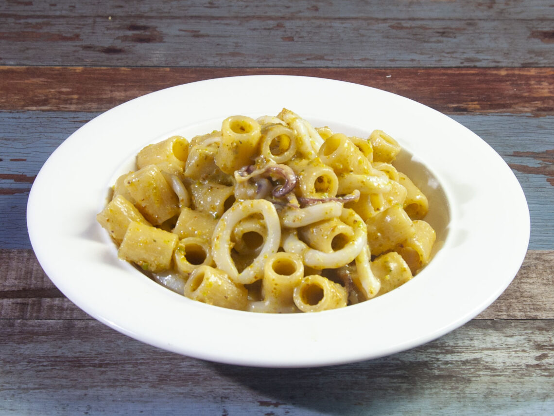 Pasta con pesto di pistacchi e calamari