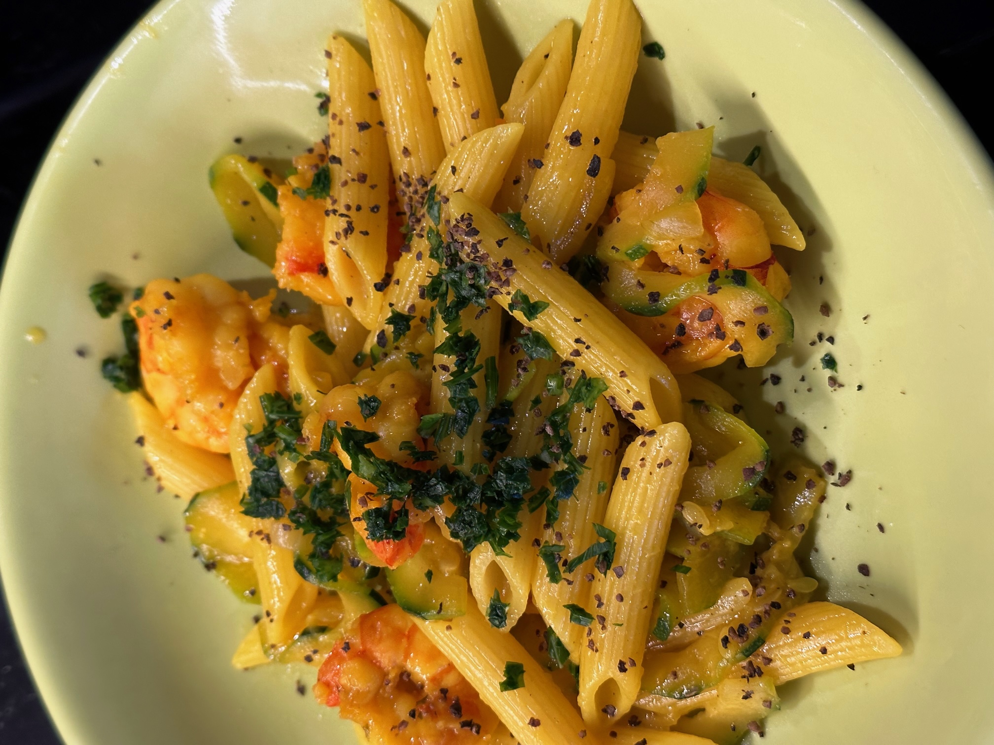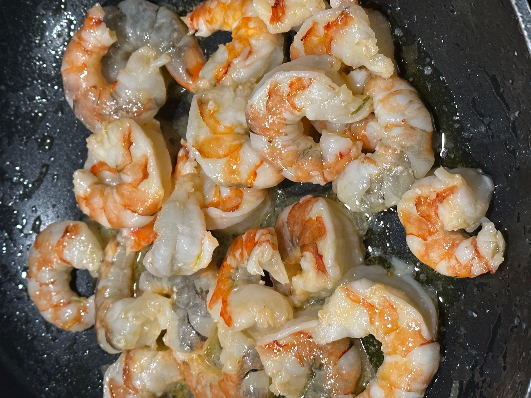 - Pulire i gamberoni eliminando il budello interno, deporli nella padella dove sono state cotte le zucchine, unire l'olio e saltarli per due minuti.