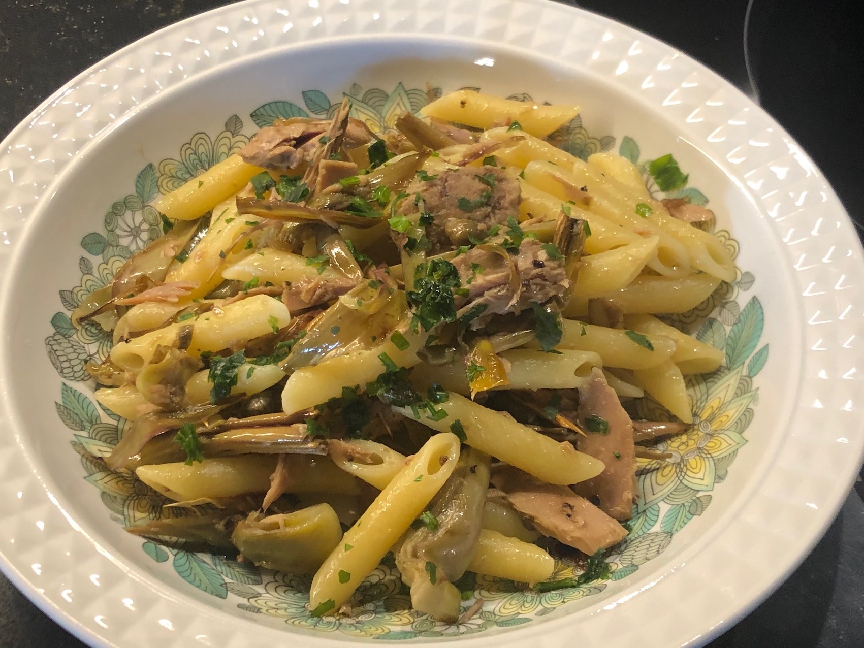 > Se si usa quello fresco, tagliarlo dapprima a cubettini, e metterlo in padella poco prima della fine della cottura dei carciofi. - Nel frattempo cuocere la pasta in acqua salata e scolarla al dente.