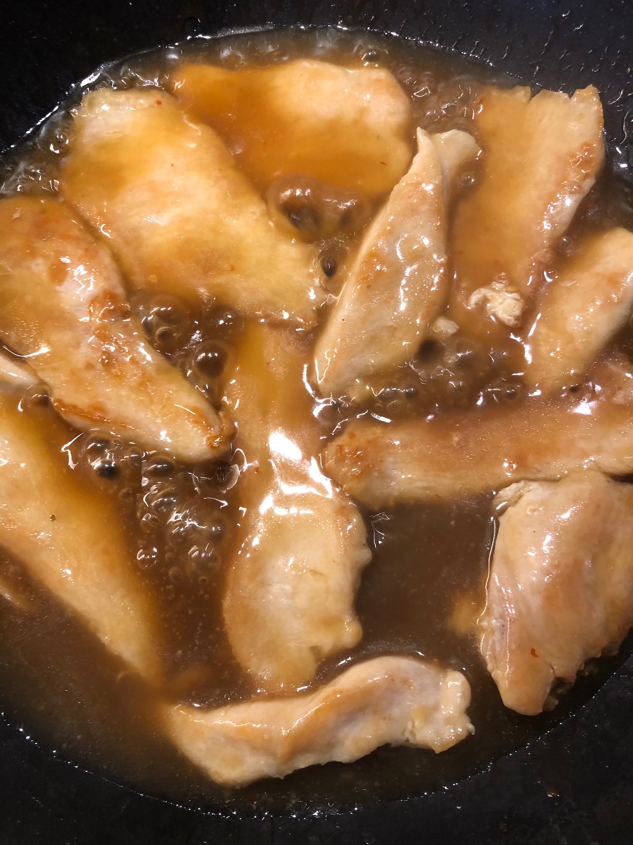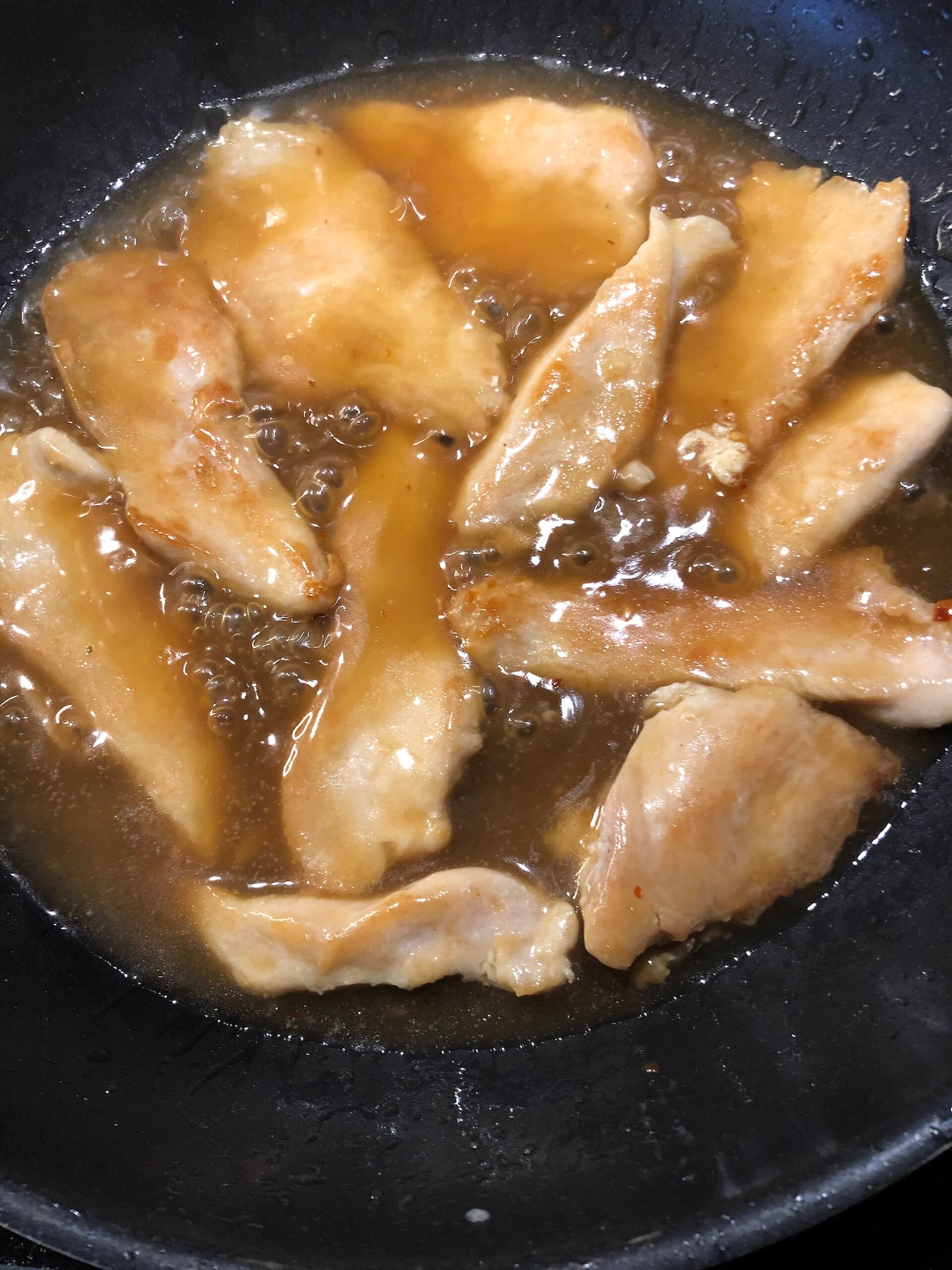 - Versare nel wok le listarelle di pollo e saltarle fino a quando non saranno ben ricoperte dalla salsa.