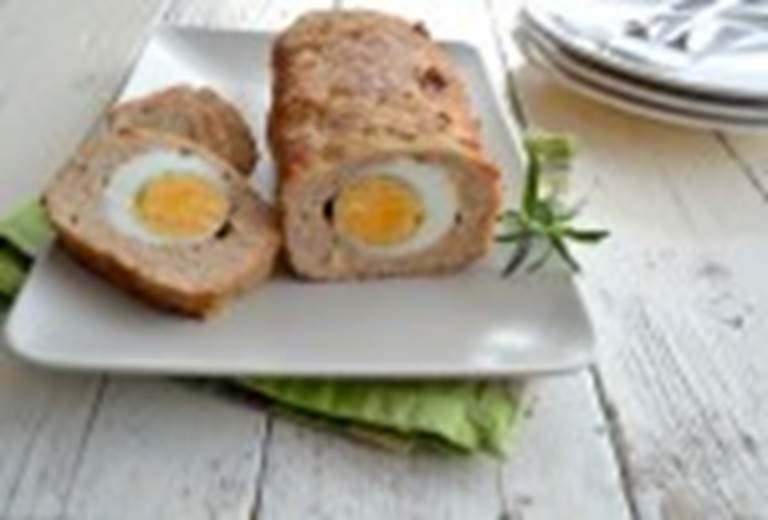 - Disporre la pancetta affettata sul fondo di una teglia da forno, collocarvi il polpettone, il rosmarino, pennellarlo con l'albume e cospargerlo con il pane grattugiato.