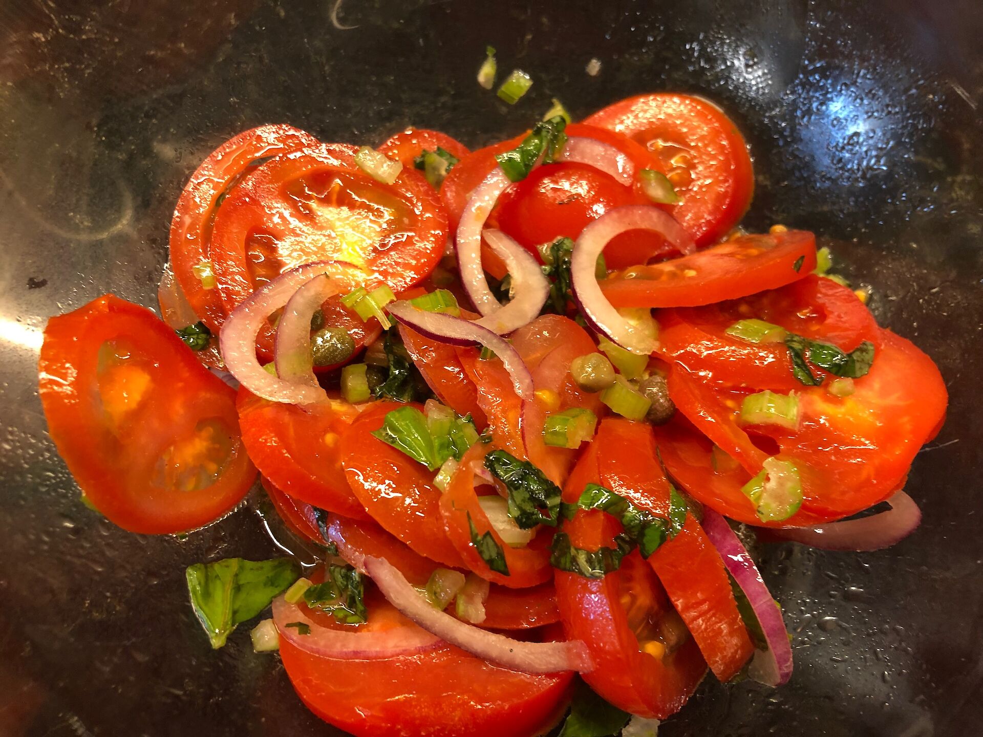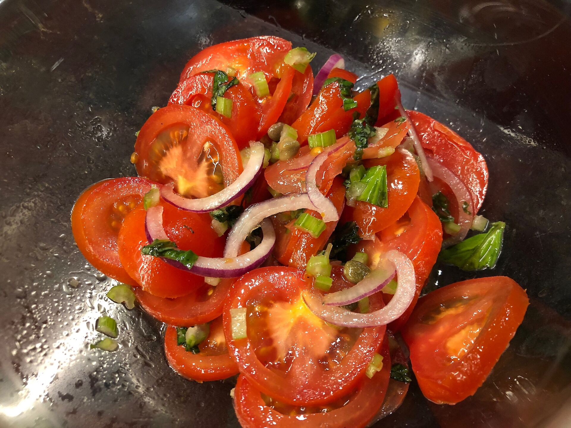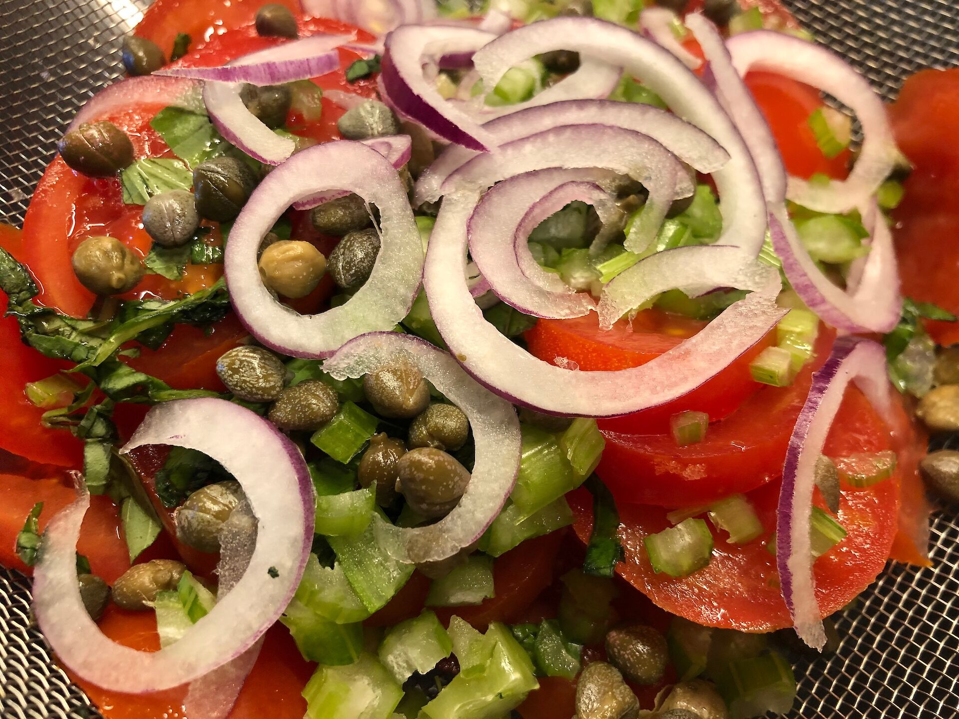 - Tagliare i pomodori a fettine, salarli e porli in un colino per fare perdere l'acqua.