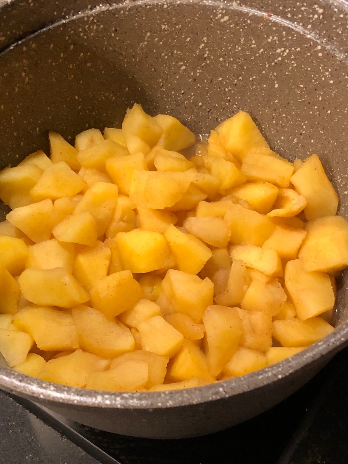 - Controllare la cottura per evitare che le mele si attacchino. Ev aggiungere ancora un pochino d’acqua.