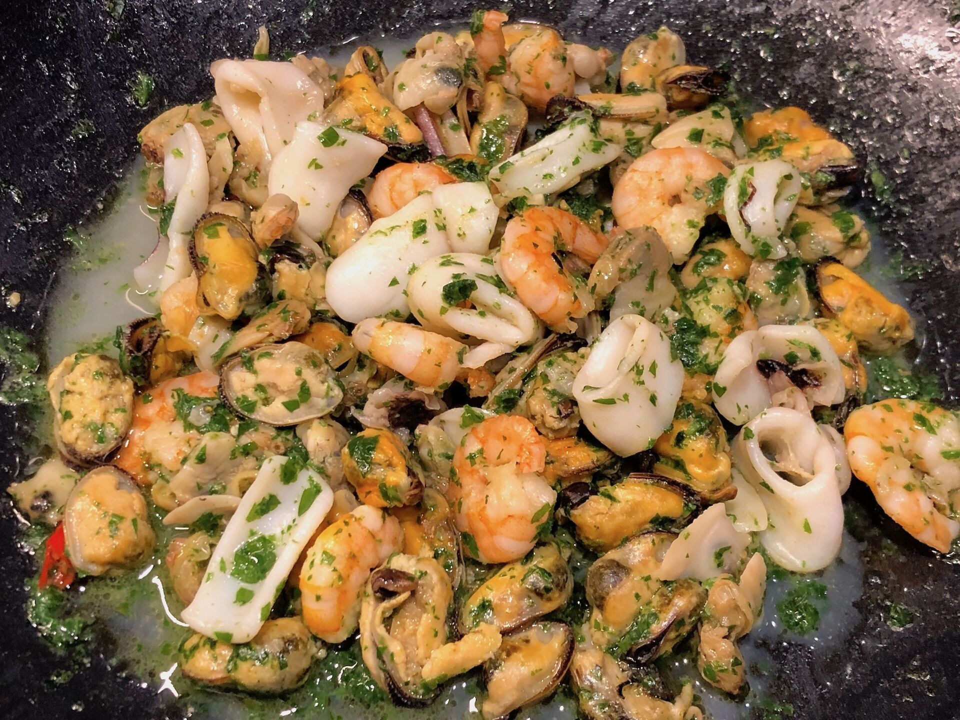 - Quando sarà completamente evaporato togliere dal fuoco e riservare calamari e gamberi. Tenerli in caldo.