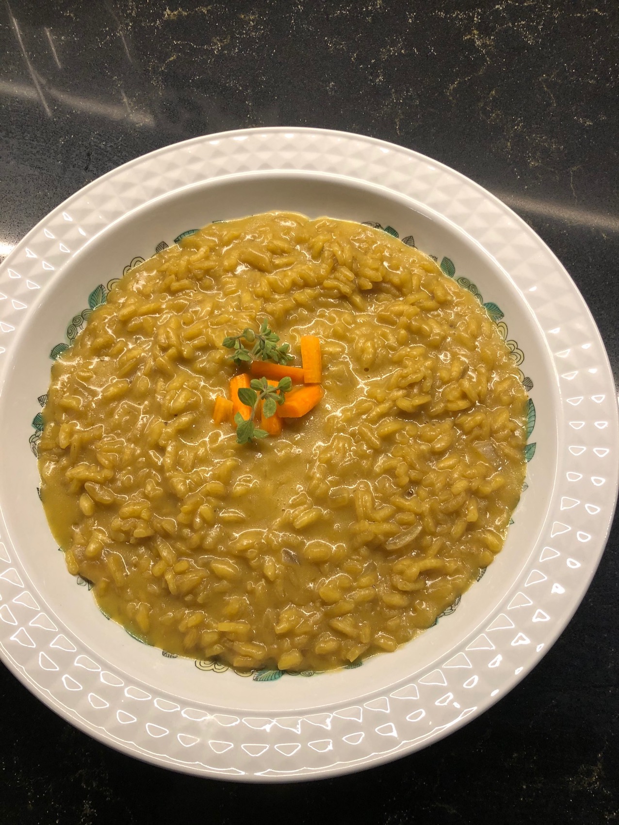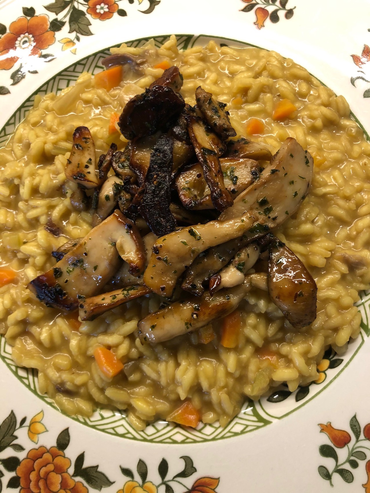 Il classico risotto "giallo", viene arricchito, a piacimento, dai funghi porcini, chanterelles o da altri tipi di accompagamento.