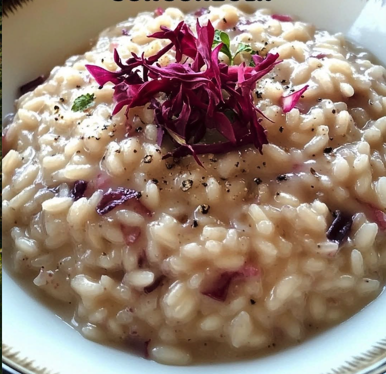 - La rosolatura iniziale in olio e cipolla viene eseguita per 5 minuti con tutto il ceppo di radicchio fatto a striscioline (tenerne da parte solo un poco per decorare il piatto).