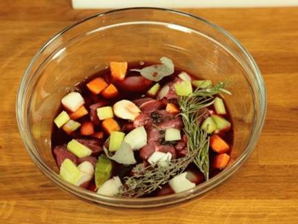- Una volta terminata la marinatura separare, in tre diverse ciotole, vino, carne e verdure.