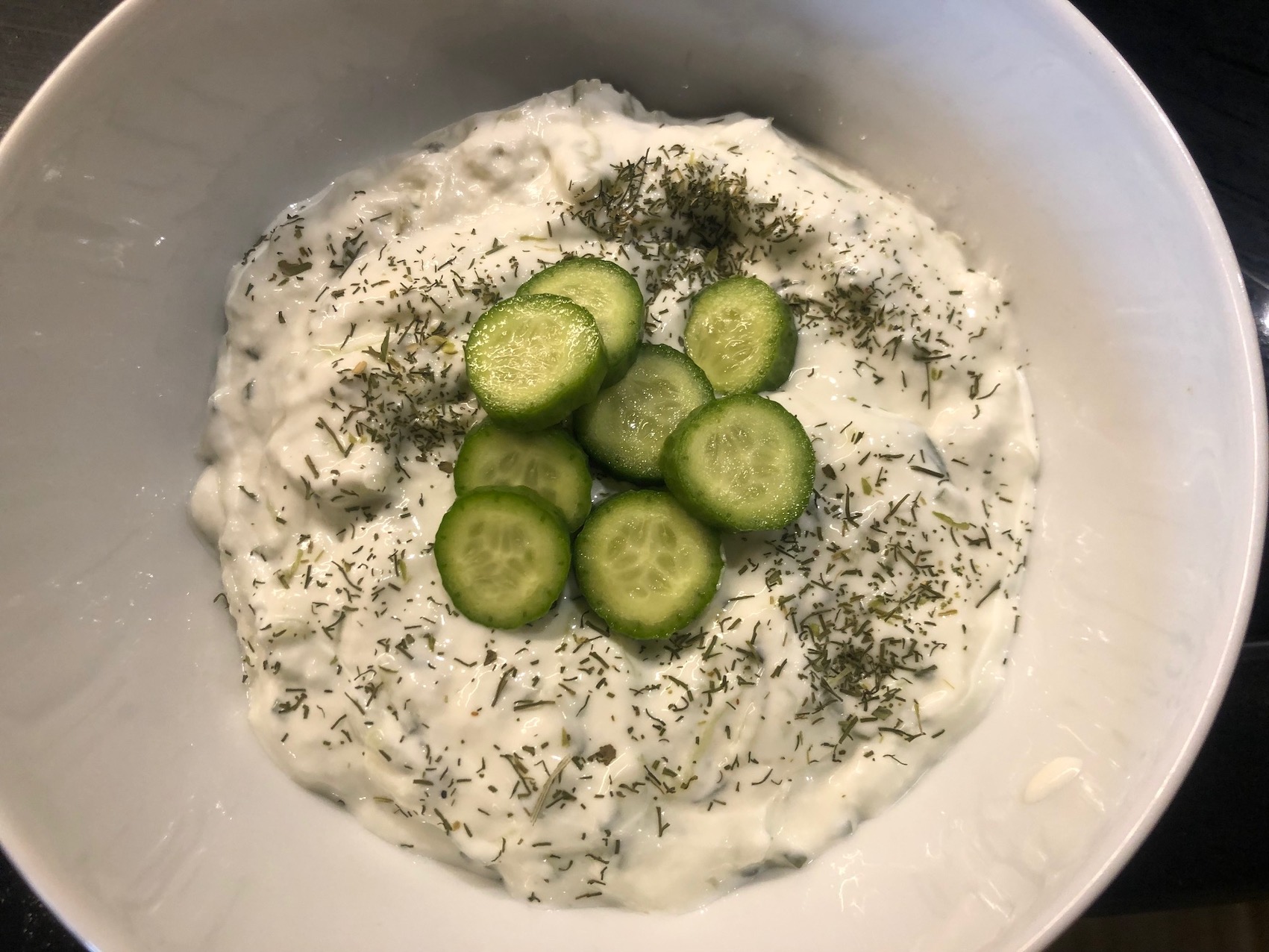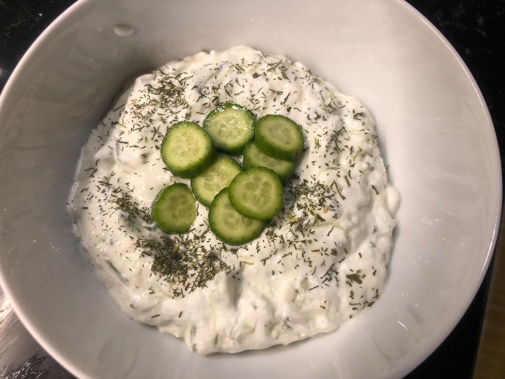 - In una ciotola versare lo yoghurt greco, unire l’aglio e il cetriolo ben strizzato.