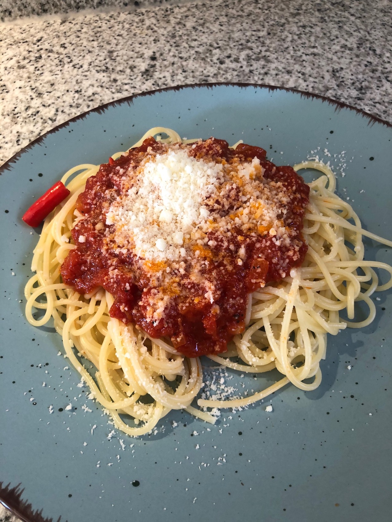 Per evitare spruzzi indesiderati va bene anche optare per amalgamare salsa e spaghetti in un contenitore o direttamente nella padella degli spaghetti (in questo caso tornerebbe utile tenere a portata un po' dell'acqua di cottura!).