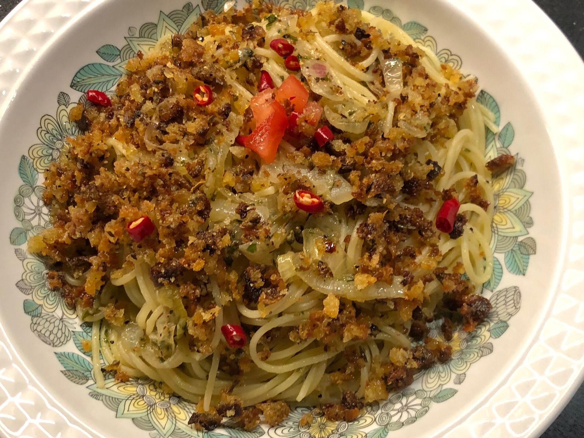 - Disporre la pasta nei piatti, cospargerla con il pane tostato, l'eventuale peperoncino e servire.