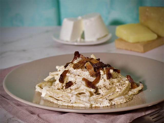 - In una ciotola unire pecorino, ricotta e pepe. Aggiungere un mestolino di acqua calda.
