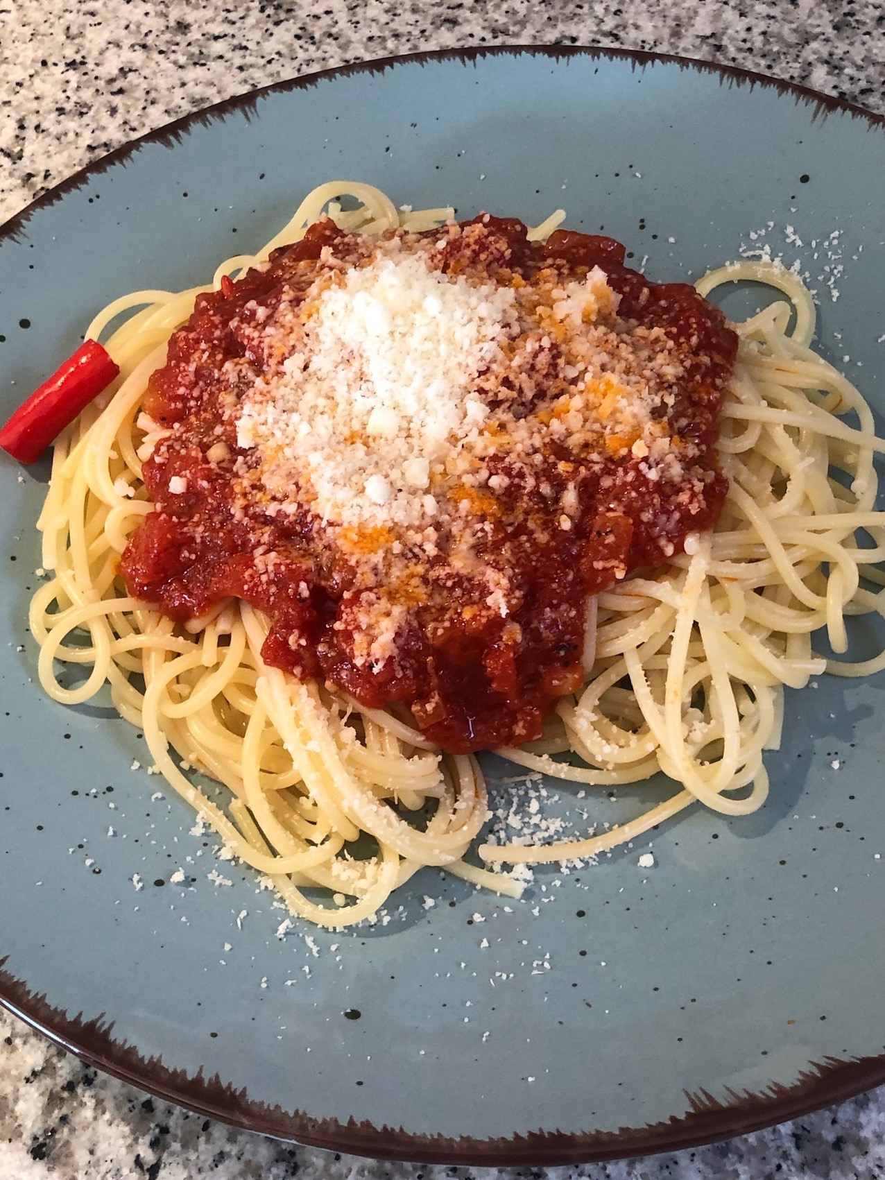 - Scaldare bene la pentola, versarvi l'olio e aggiungere la cipolla tritata, il peperoncino e un pizzico di origano.