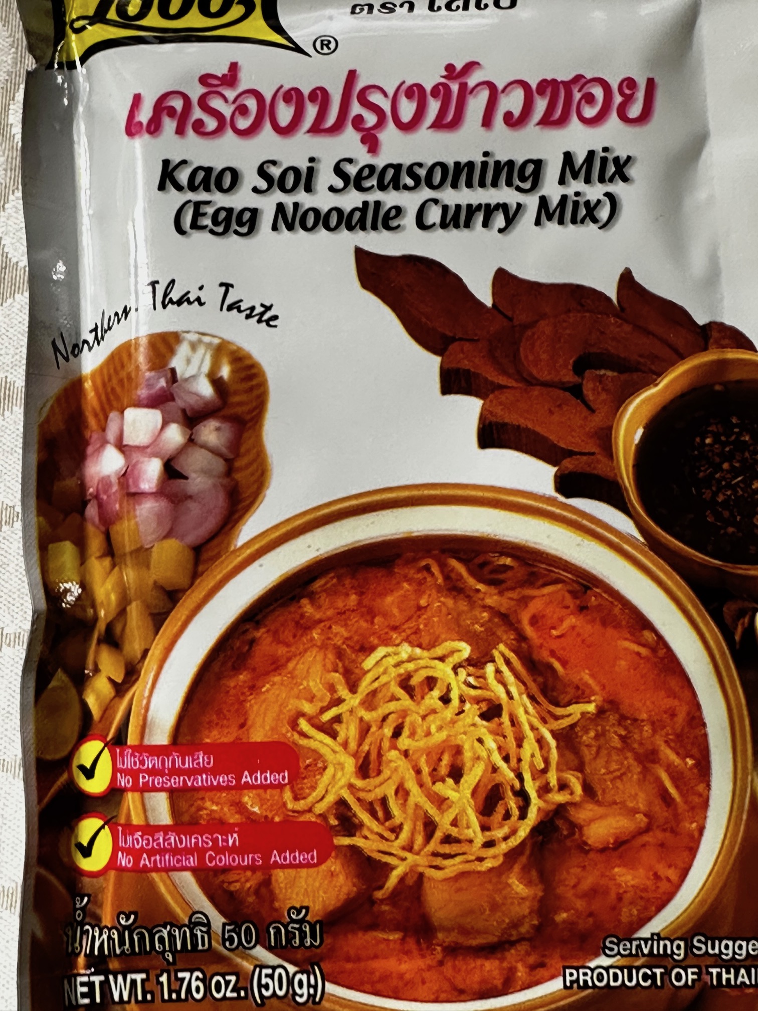 - Denominazioni: con pollo KHAO SOY GAI; variante manzo KHAO SOY NEU
